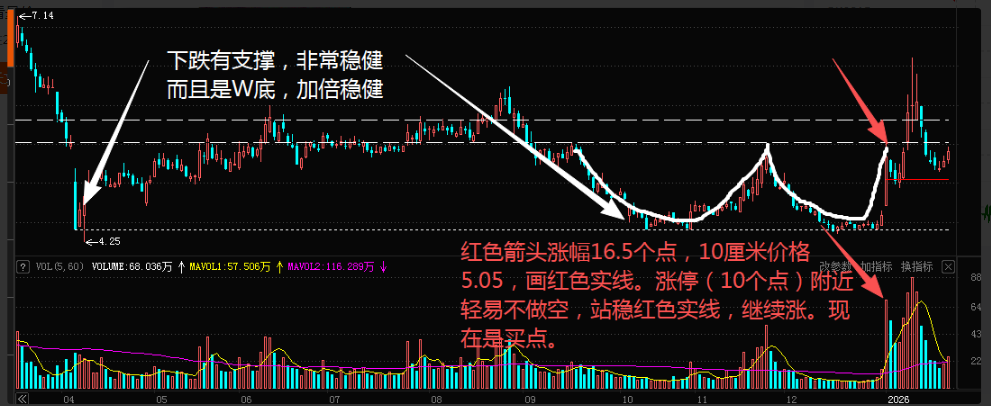 2. 红色箭头涨幅16.5个点,10厘米位置价格5.05,画一条红线,涨停10厘米附近,轻易不看空。