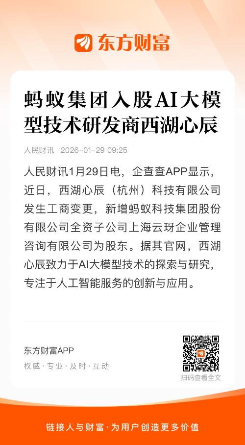 人民财讯1月29日电,企查查APP显示,近日,西湖心辰(杭州)科技有限公司发生工商变更,新增蚂蚁科技集团股份有限公司全资子公司上海云玡企业管理咨询有限公司为股东。据其官网,西湖心辰致力于AI大模型技术的探索与研究,专注于人工智能服务的创新与应用。