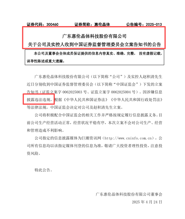 · 买入时间:2025年4月24日(含当日)前买入惠伦晶体股票。