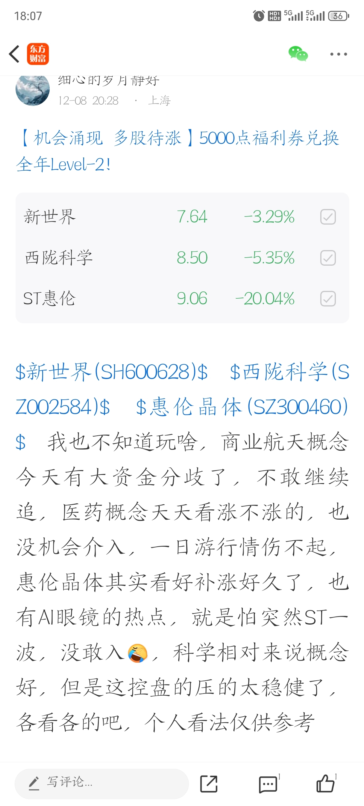 惠伦的各位还在吗,差点冲进去了,还好刹车及时,走势可以参考ST东通,感觉ST通脉