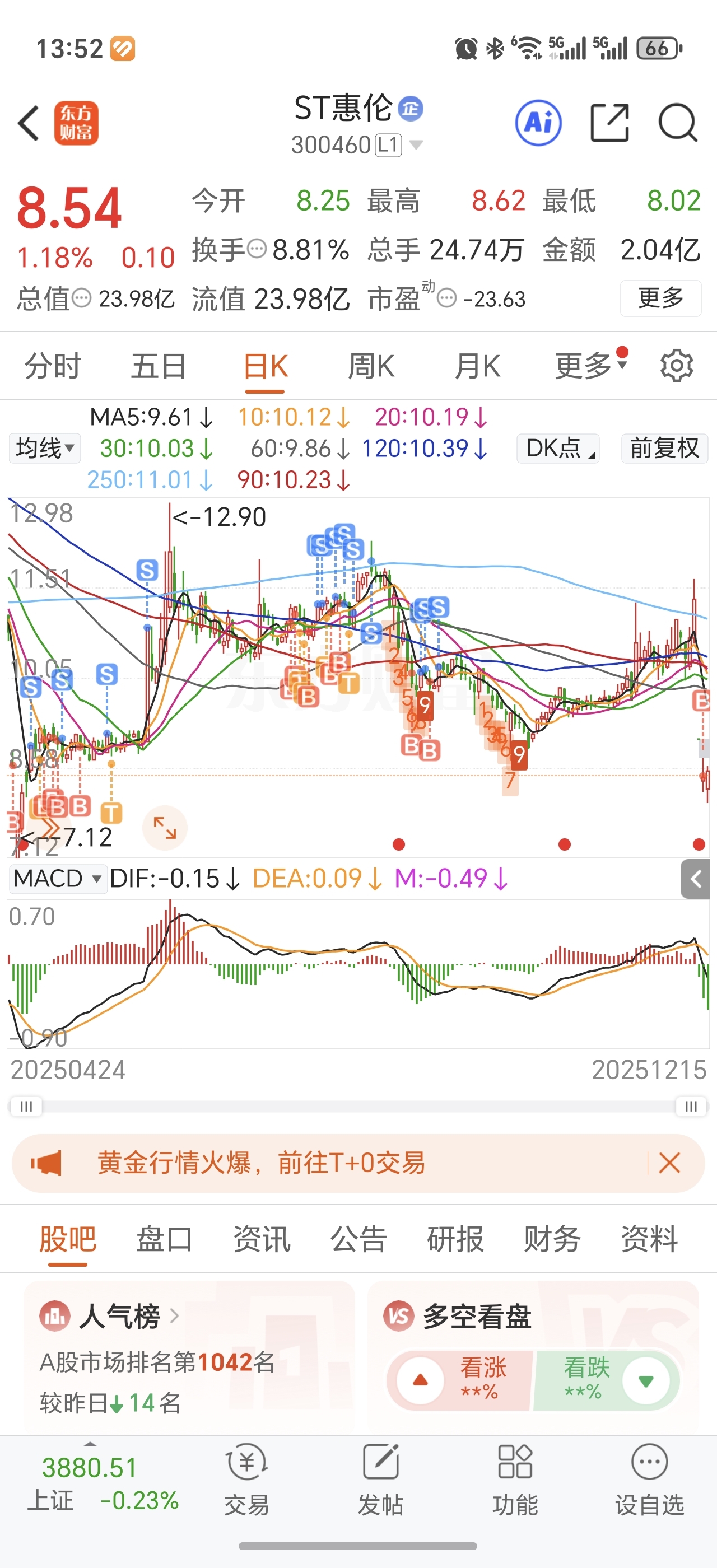 $ST惠伦(SZ300460)$ 兄弟们,我又来了,上次也是趁跌20个点进的,现在又进了点。上个月看他涨都不敢动,就怕这货案子落地肯定要完蛋。
