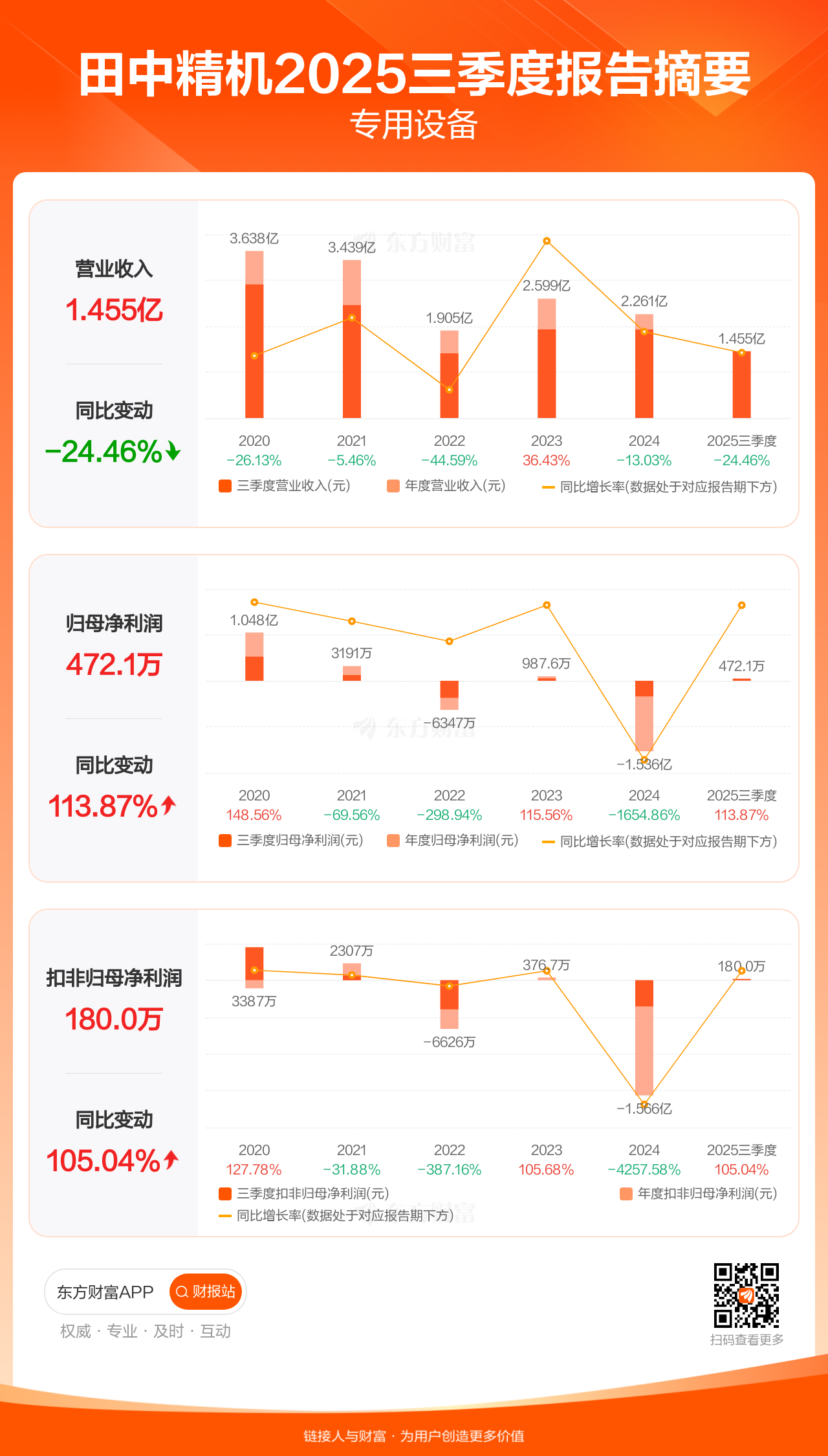 田中精机10月29日发布2025年三季报显示,公司前三季实现营业收入1.45亿元,同比下滑24.46%;归母净利润472.12万元,同比增长113.87%;扣非归母净利润180.00万元,同比增长105.04%。