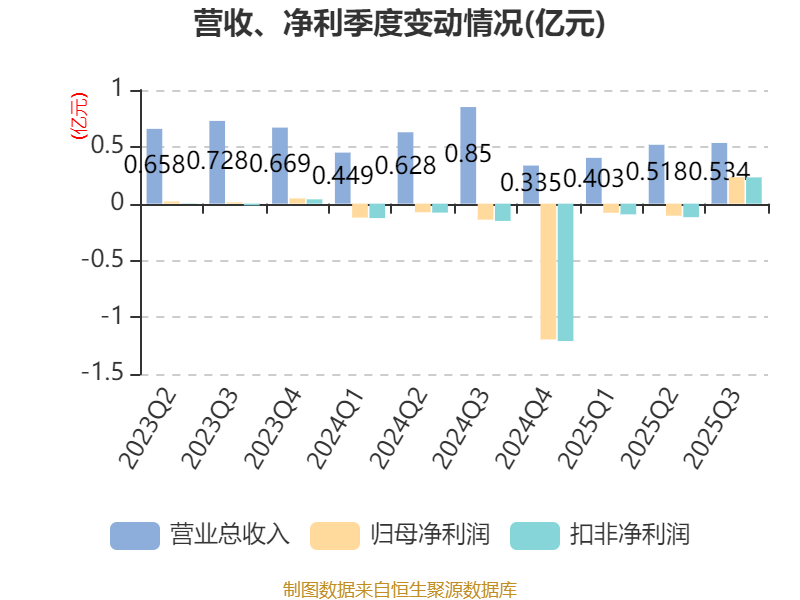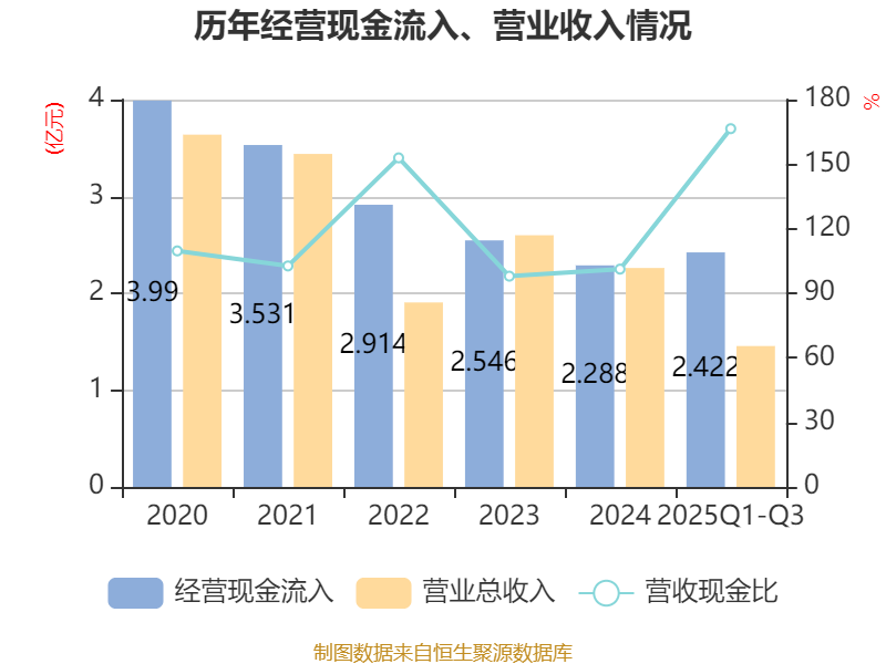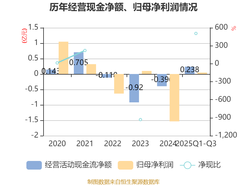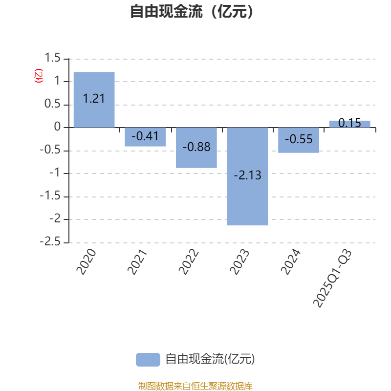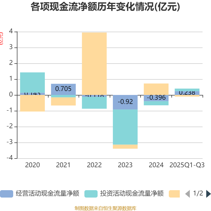2025年前三季度,公司经营活动现金流净额为2384.27万元,同比增加5914.54万元;筹资活动现金流净额-1016.03万元,同比减少6658.24万元;投资活动现金流净额1635万元,上年同期为-3213.14万元。