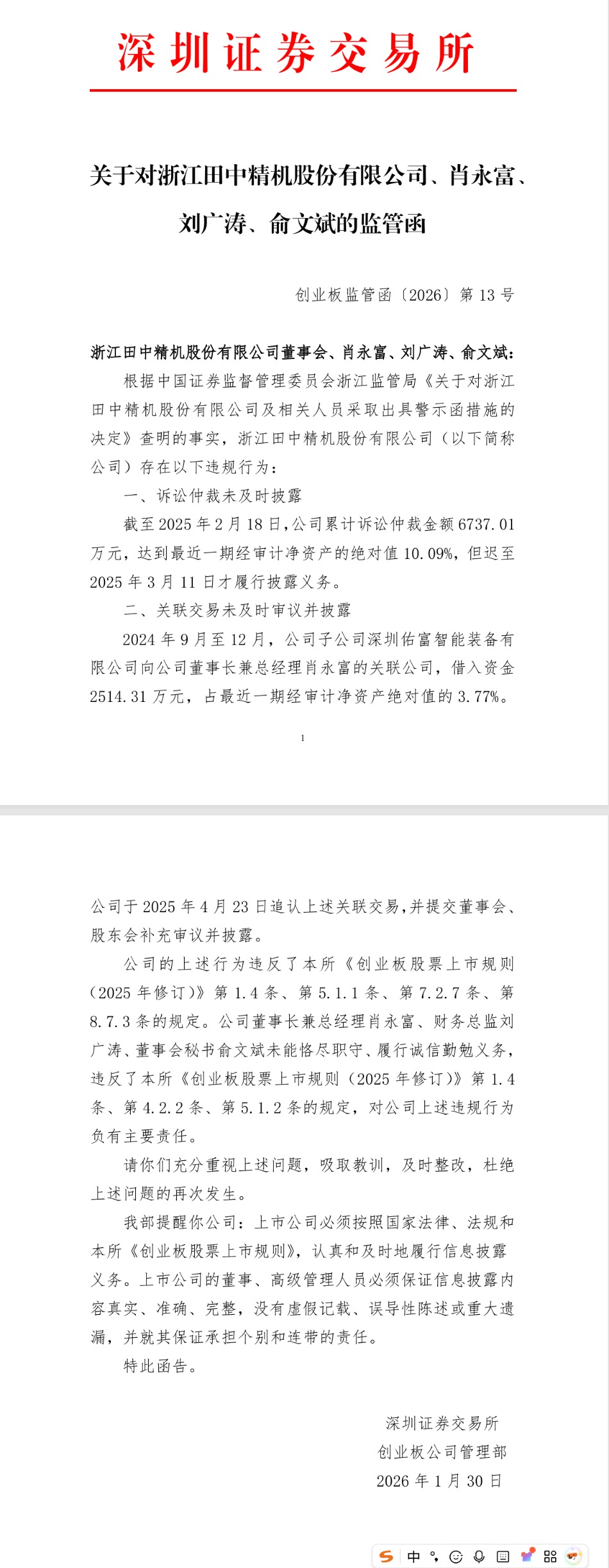 田中精机收到深交所监管函