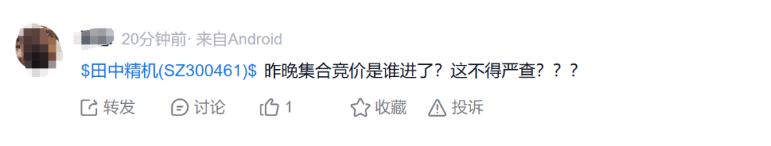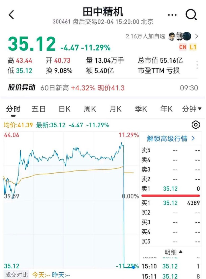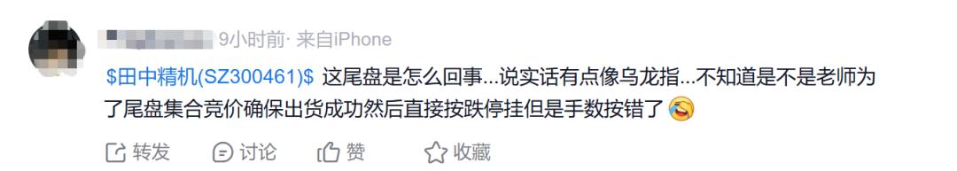 值得关注的是,昨日田中精机在尾盘集合竞价阶段大跳水,瞬间暴跌20%,当日收盘跌幅为11.29%,此举被网友纷纷吐槽“一字断魂刀重出江湖”“像是乌龙指”“炒股别用曲面屏”。