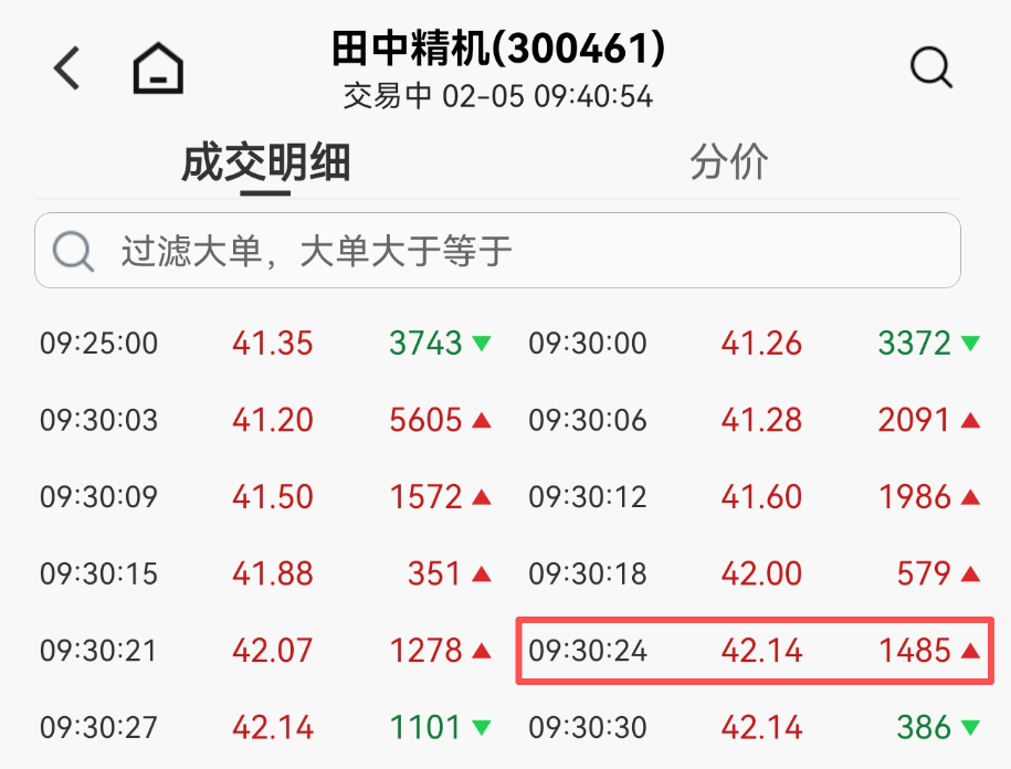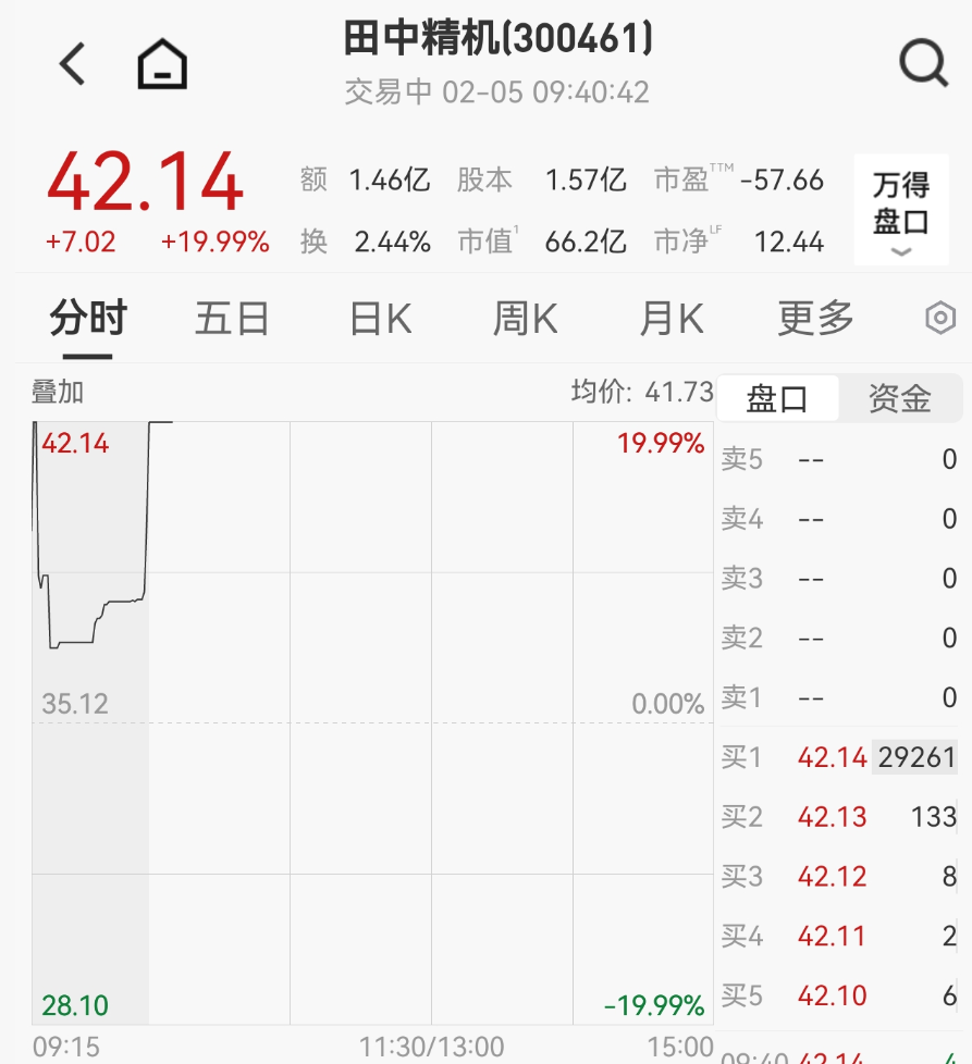 2月5日,田中精机开盘后迅速获资金买入,仅用24秒即封住涨停板,报42.14元/股。截至发稿,田中精机仍保持20cm涨停状态,总市值超66亿元。