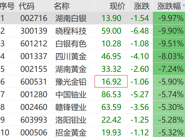 上午有色金属板块继续走低,湖南白银跌停,白银有色接近跌停,晓程科技、四川黄金、湖南黄金等多股大跌。