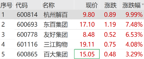 商贸零售板块拉升,杭州解百涨停,东百集团、友好集团等跟涨。