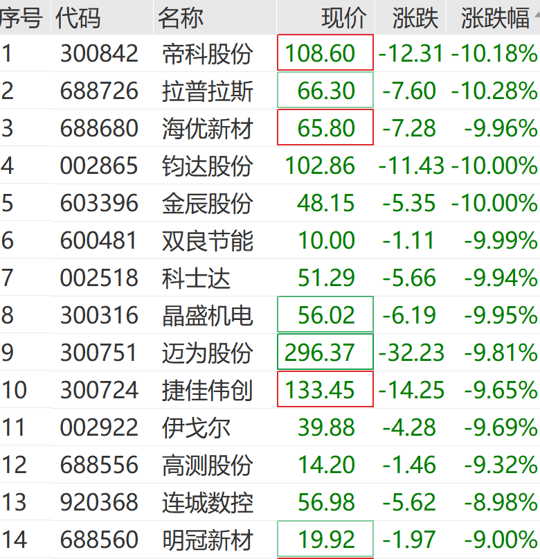 个股方面,帝科股份、拉普拉斯跌超10%,金辰股份、钧达股份、双良节能、科士达等多股跌停,晶盛机电、晶科能源、高测股份等集体走低。