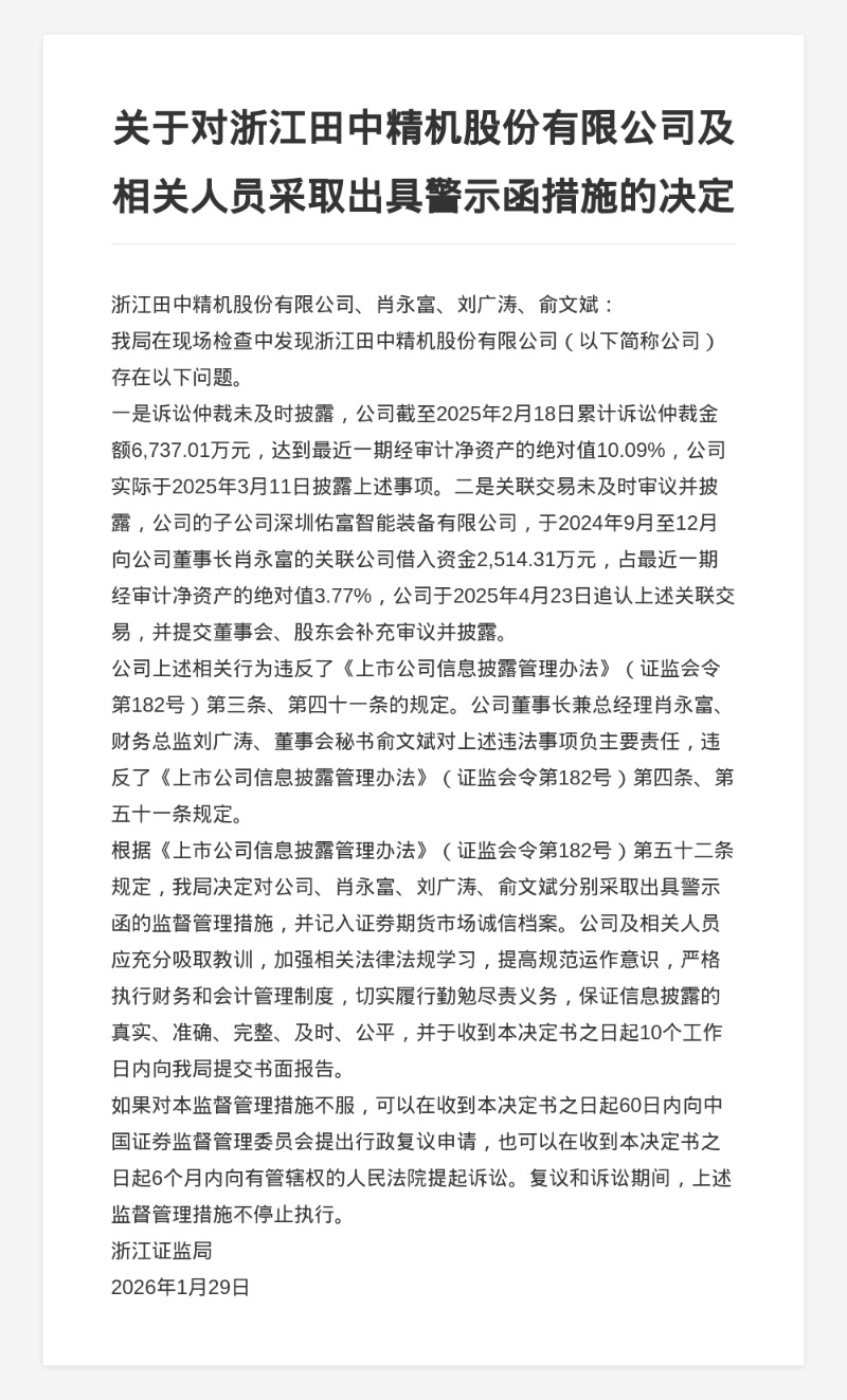 决定书显示,浙江田中精机股份有限公司存在以下问题:一是诉讼仲裁未及时披露,公司截至2025年2月18日累计诉讼仲裁金额6,737.01万元,达到最近一期经审计净资产的绝对值10.09%,公司实际于2025年3月11日披露上述事项。二是关联交易未及时审议并披露,公司的子公司深圳佑富智能装备有限公司,于2024年9月至12月向公司董事长肖永富的关联公司借入资金2,514.31万元,占最近一期经审计净资产的绝对值3.77%,公司于2025年4月23日追认上述关联交易,并提交董事会、股东会补充审议并披露。
