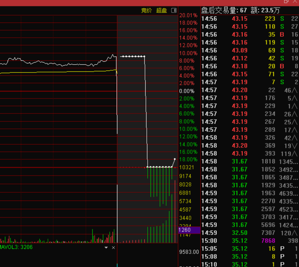 31.67跌停板,今天收盘价42.14,收益33.06%,时间不到一天。