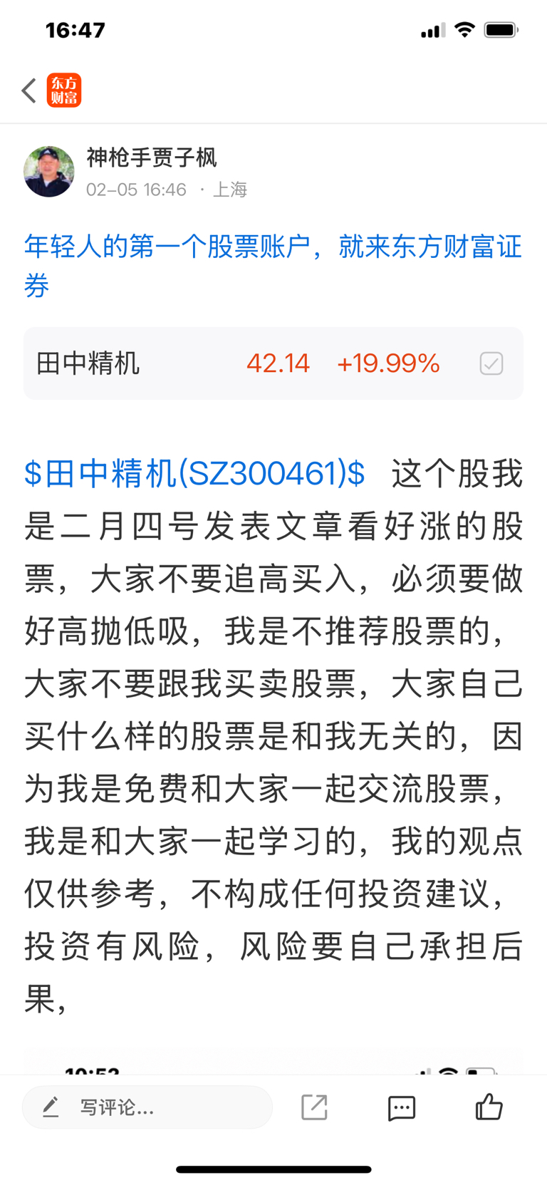 $田中精机(SZ300461)$ 这个股我是二月四号发帖看涨的股票,大家不要追高买入,必须要做好高抛低吸,我是不推荐股票的,大家不要跟我买卖股票,大家自己买什么样的股票是和我无关的,因为我是免费和大家一起交流股票,我是和大家一起学习的,我的观点仅供参考,不构成任何投资建议,投资有风险,风险要自己承担后果,