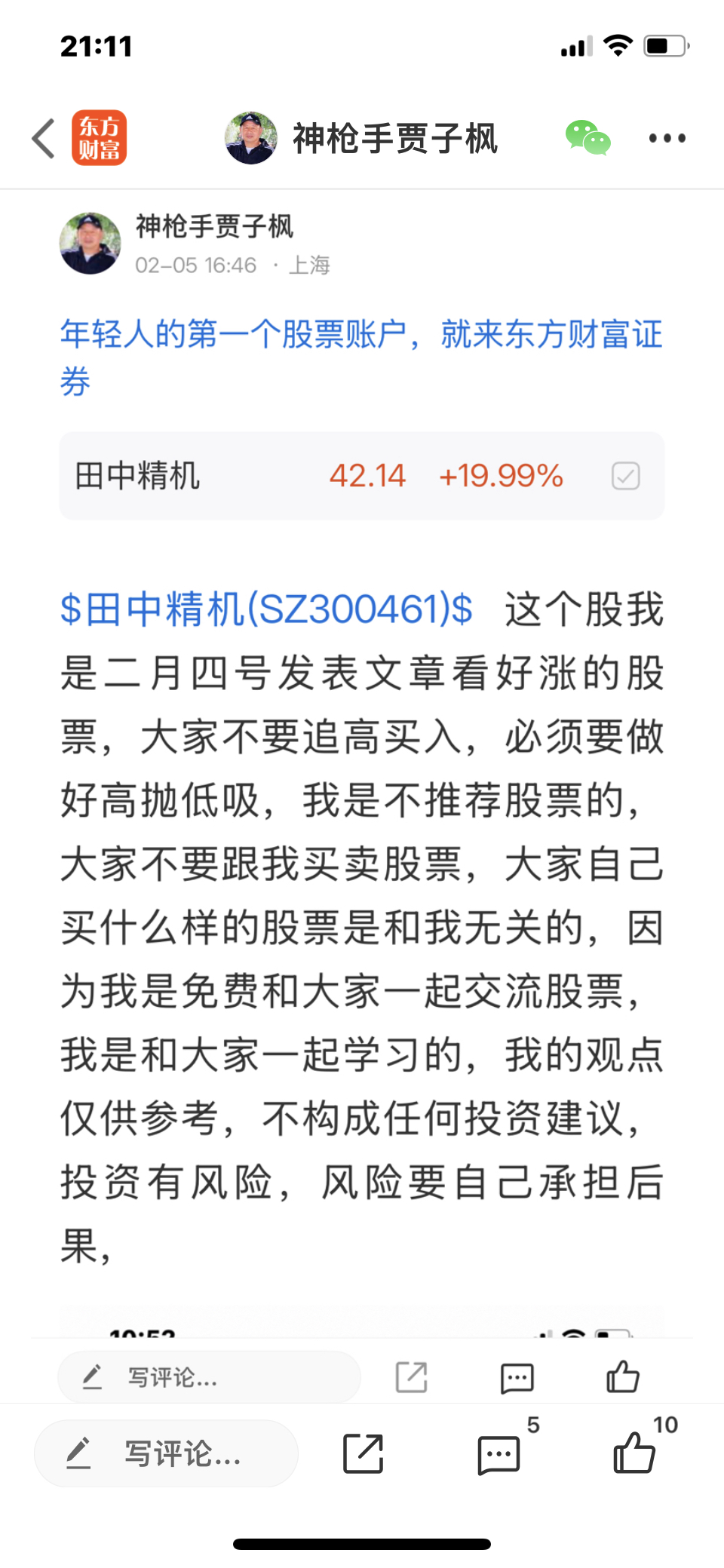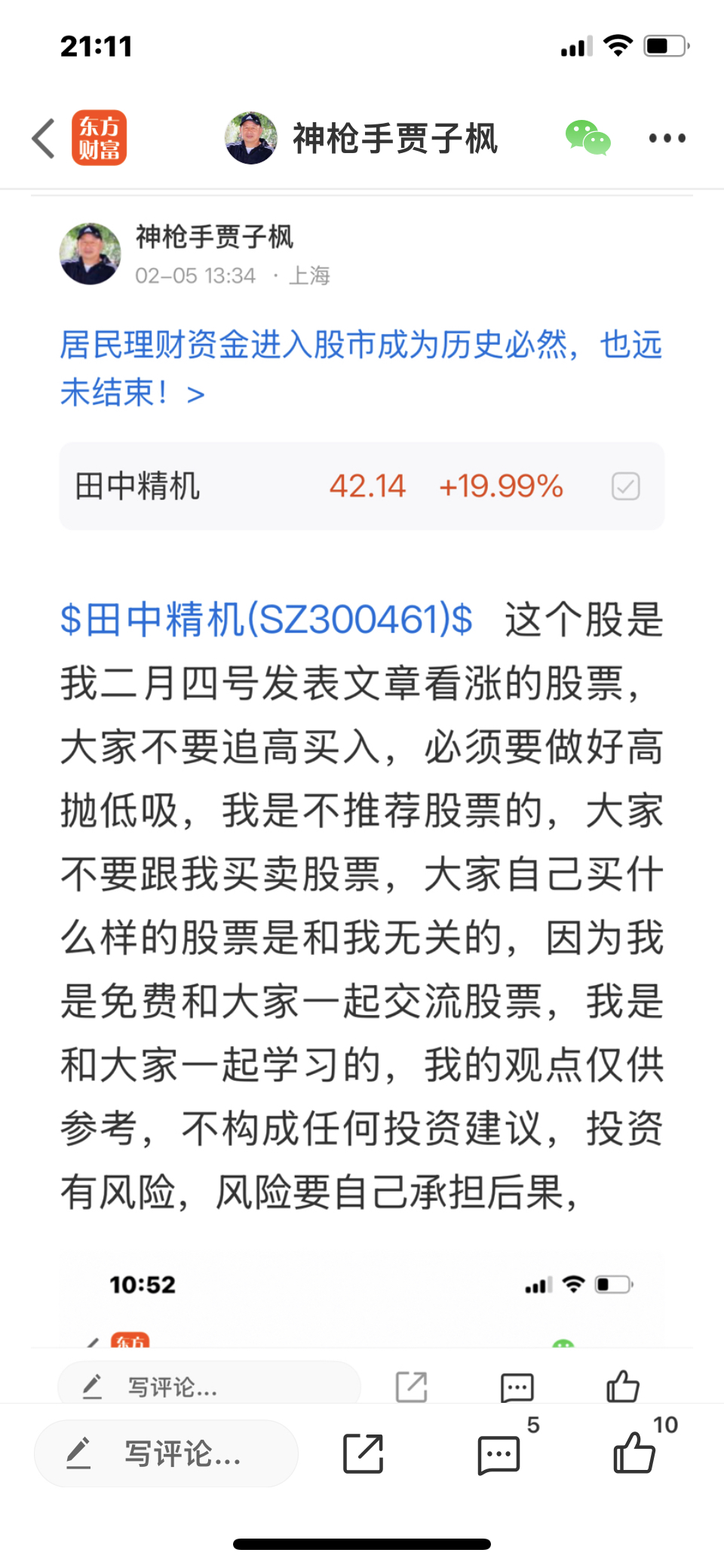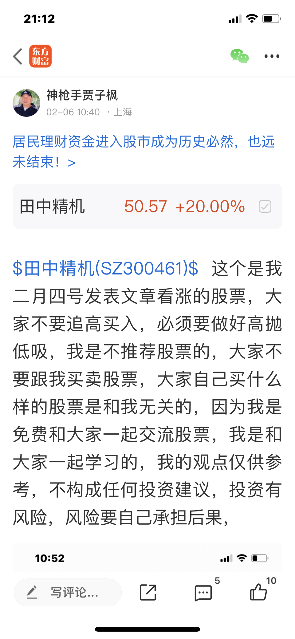 $田中精机(SZ300461)$ 这个股我是二月四号发表文章看涨的股票,大家不要追高买入,必须要做好高抛低吸,我是不推荐股票的,大家不要跟我买卖股票,大家自己买什么样的股票是和我无关的,因为我是免费和大家一起交流股票,我是和大家一起学习的,我的观点仅供参考,不构成任何投资建议,投资有风险,风险要自己承担后果,