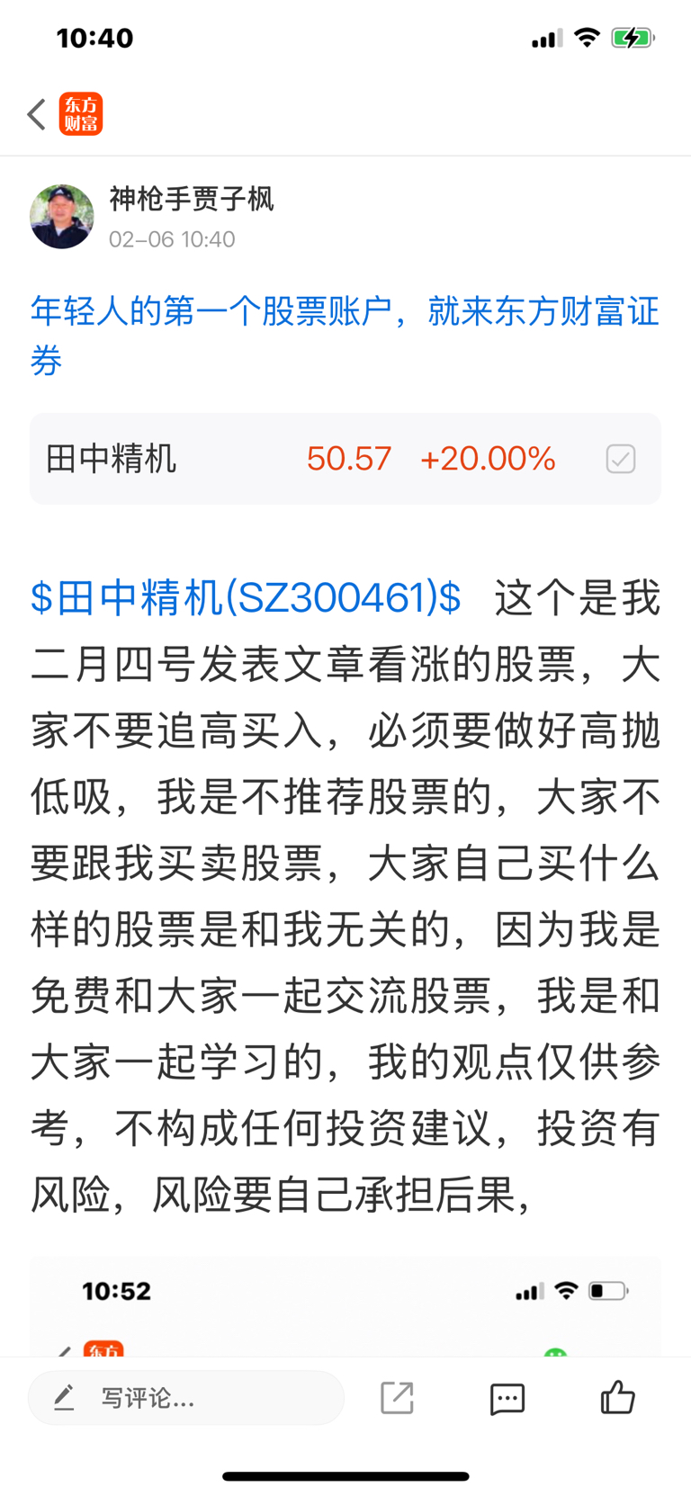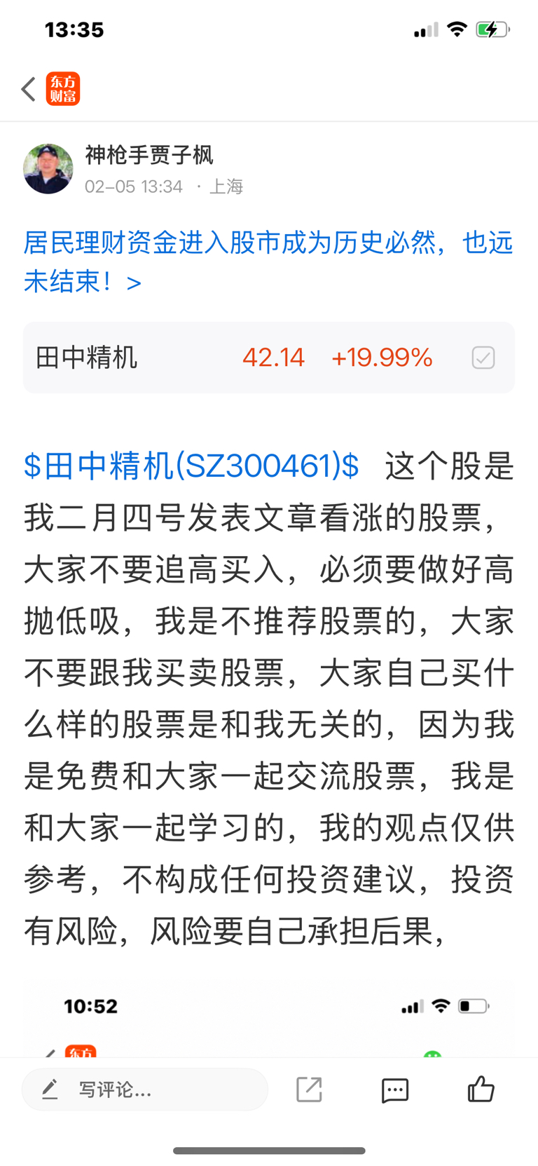 $田中精机(SZ300461)$ 这个是我二月四号发表文章看涨的股票,大家不要追高买入,必须要做好高抛低吸,我是不推荐股票的,大家不要跟我买卖股票,大家自己买什么样的股票是和我无关的,因为我是免费和大家一起交流股票,我是和大家一起学习的,我的观点仅供参考,投资有风险,风险要自己承担后果,