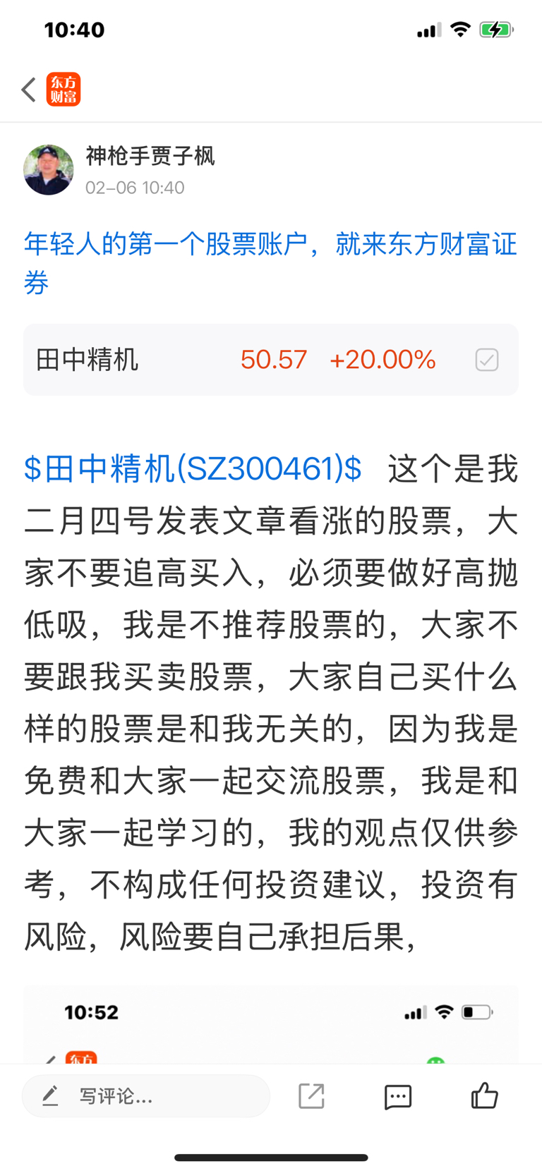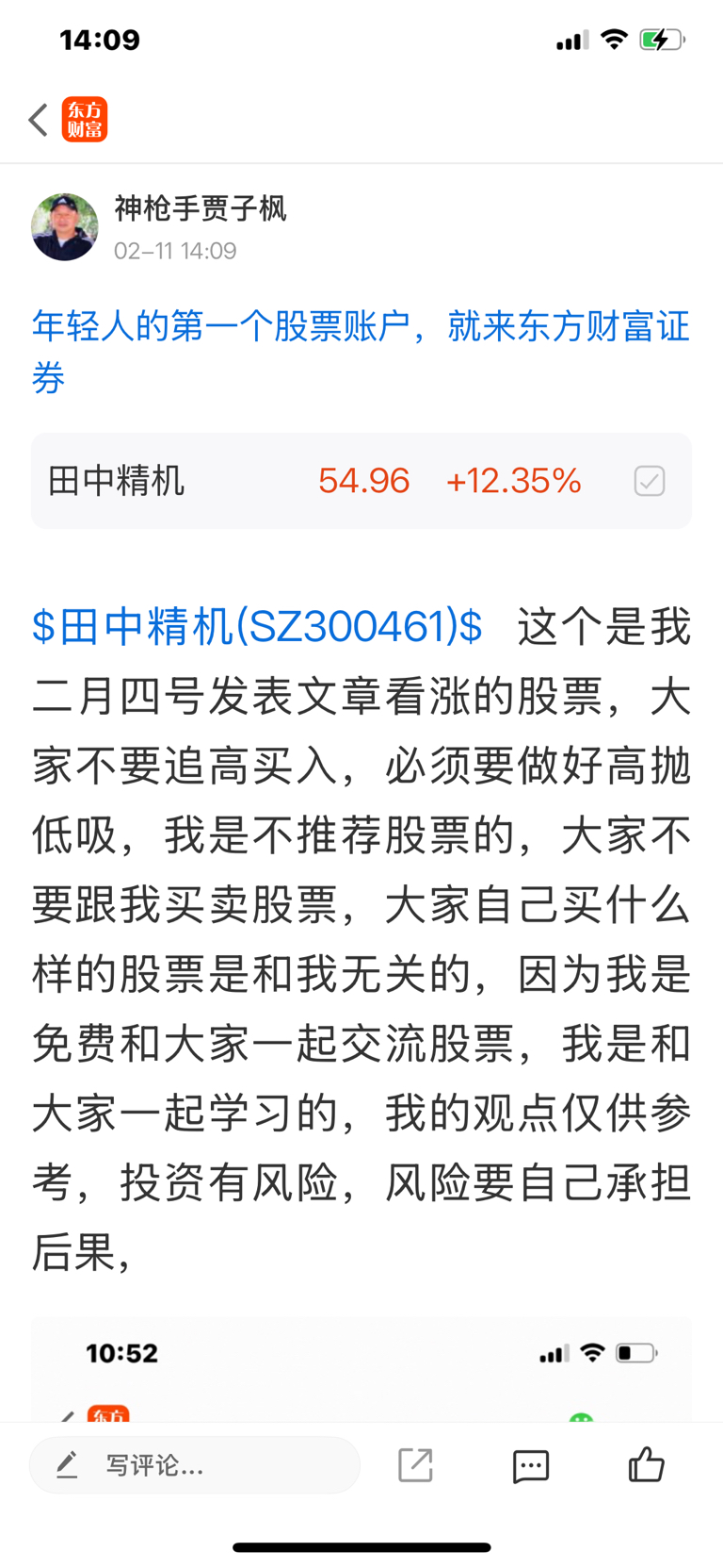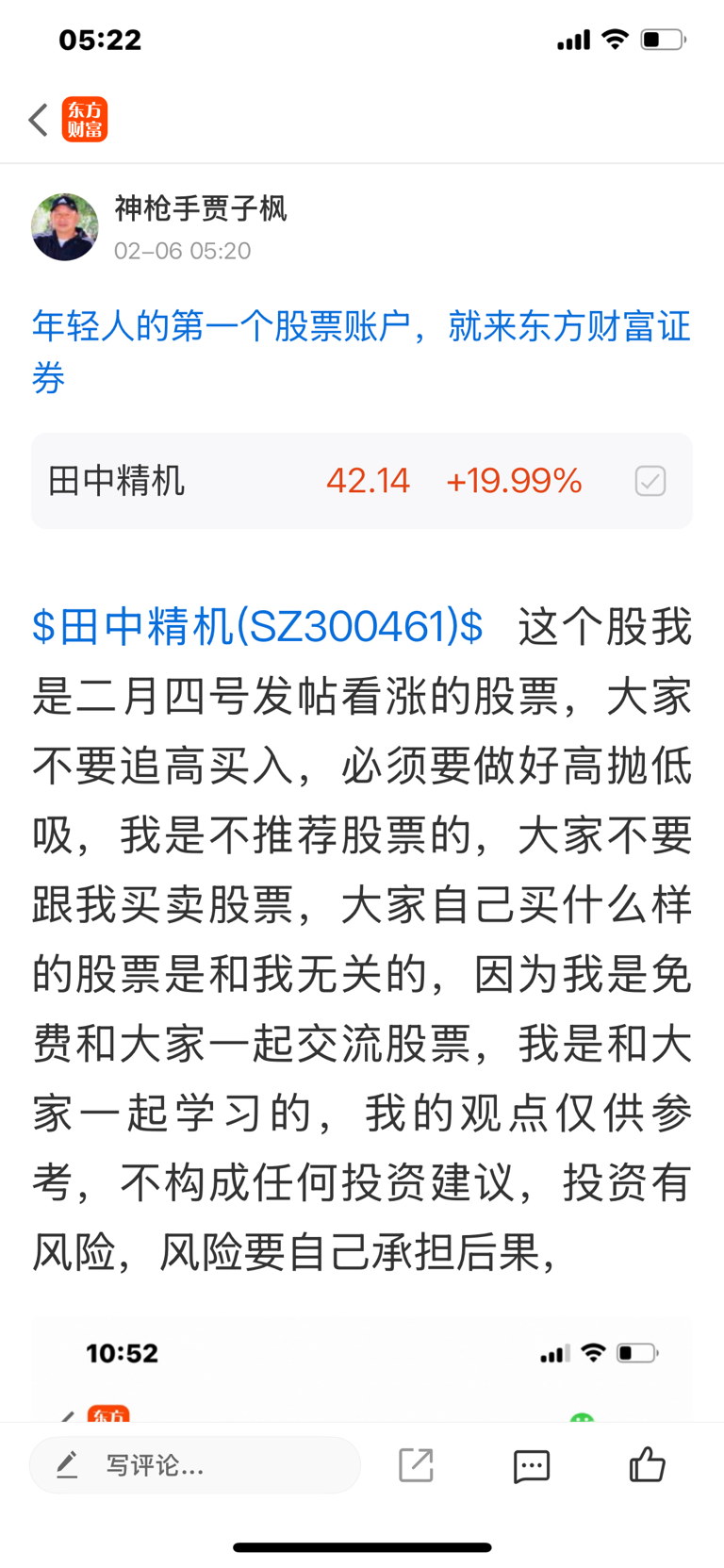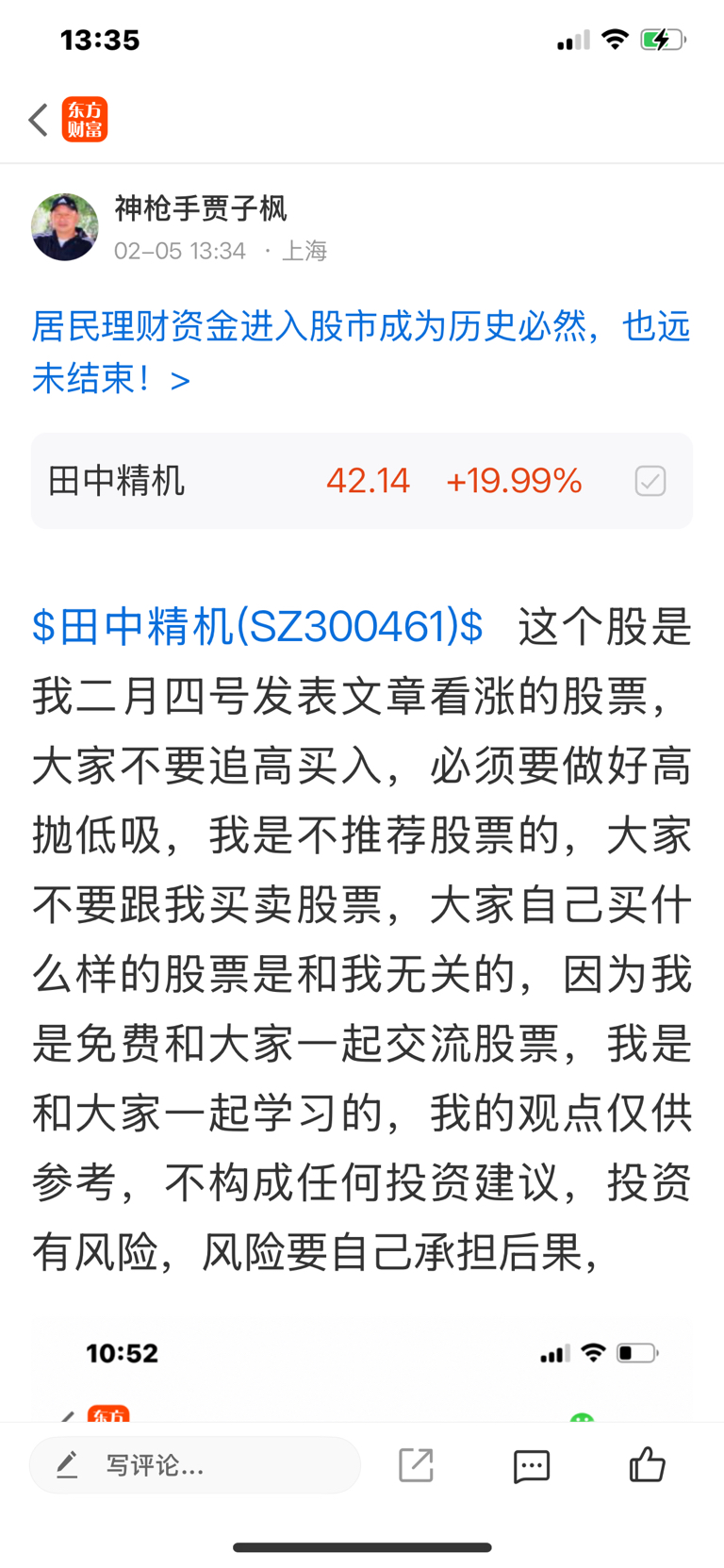 $田中精机(SZ300461)$ 这个股是我二月四号发表文章看涨的股票,大家不要追高买入,必须要做好高抛低吸,我是不推荐股票的,大家不要跟我买卖股票,大家自己买什么样的股票是和我无关的,因为我是免费和大家一起交流股票,我是和大家一起学习的,我的观点仅供参考,投资有风险,风险要自己承担后果,