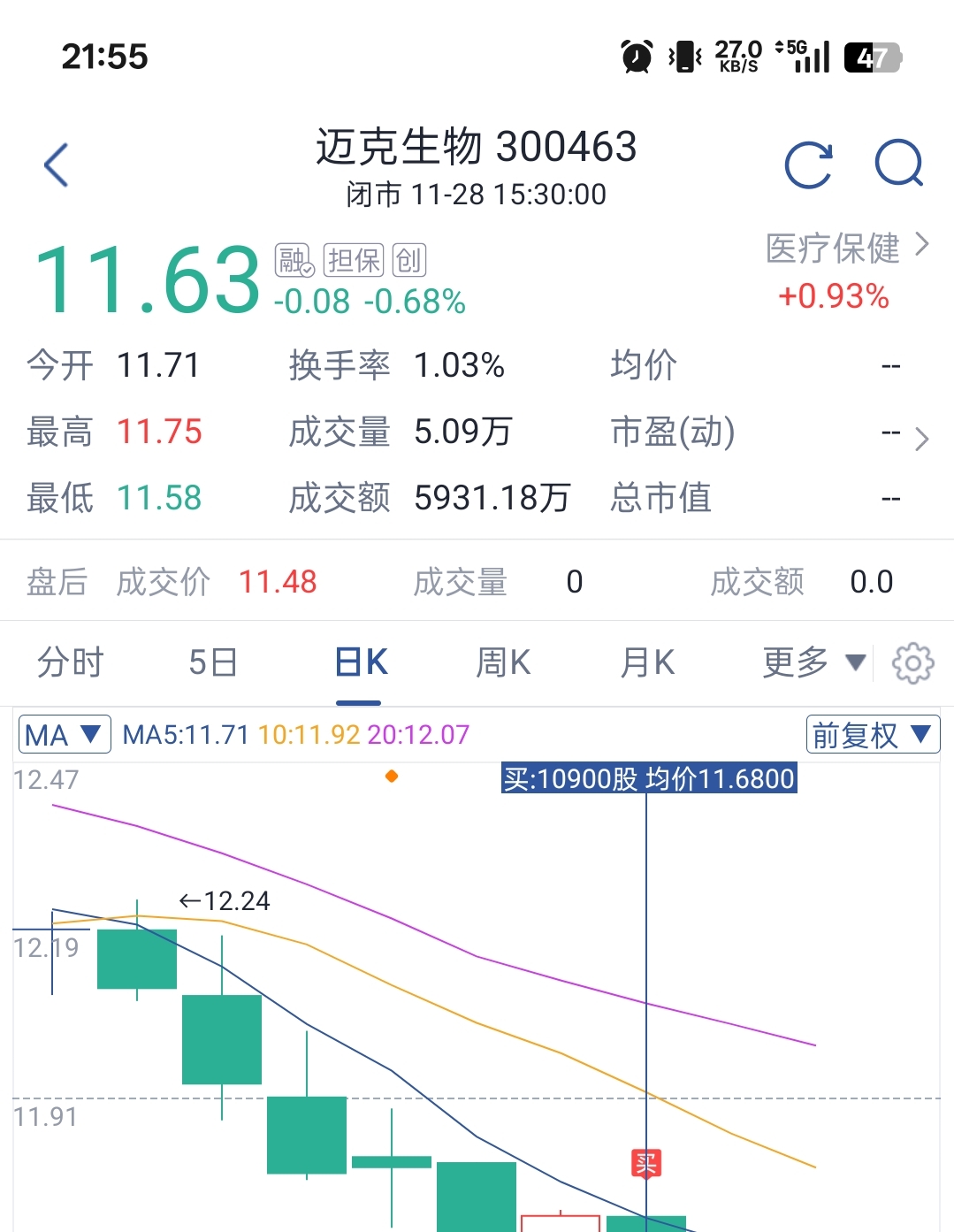 $迈克生物(SZ300463)$ 迈克生物11.68元买了10900股,希望能赚钱