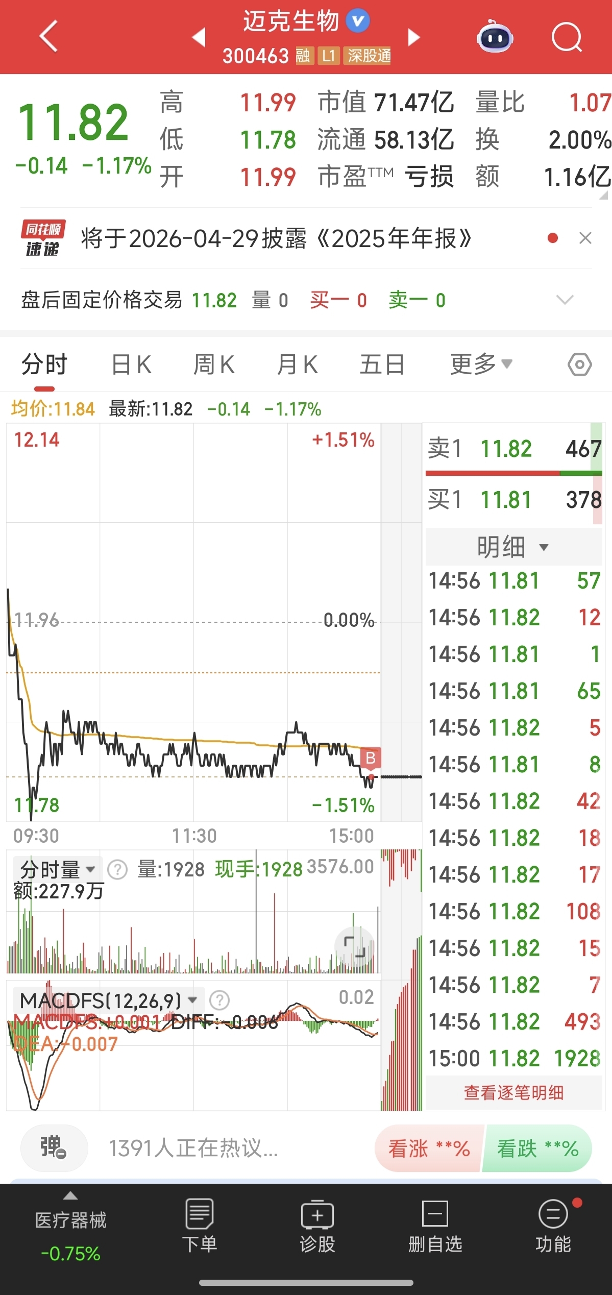 $迈克生物(SZ300463)$ 尾盘加仓迈克生物,亏了一个多点!