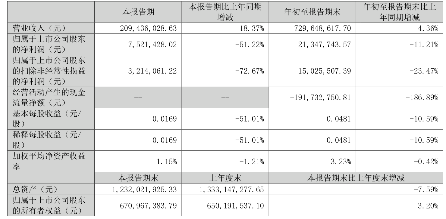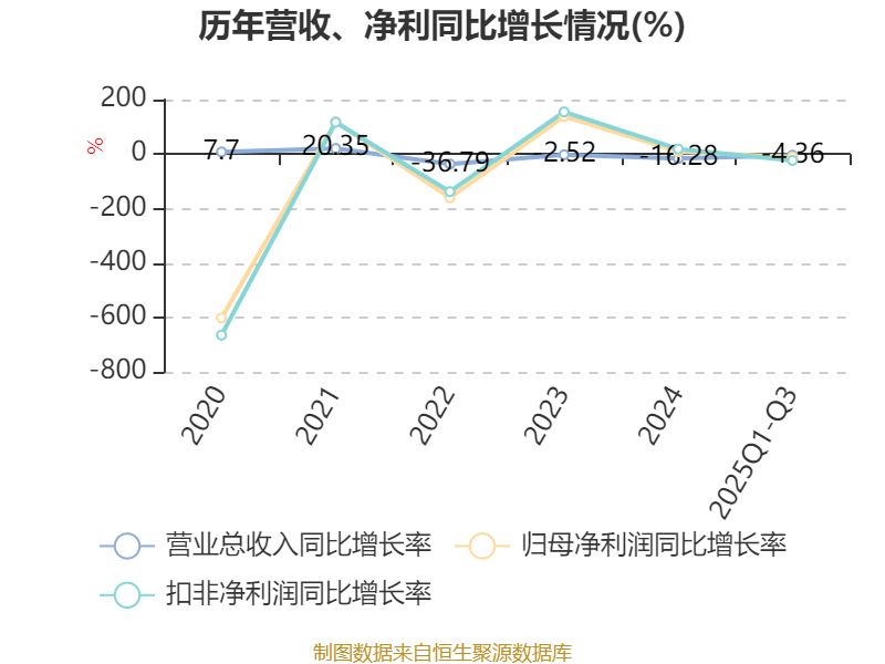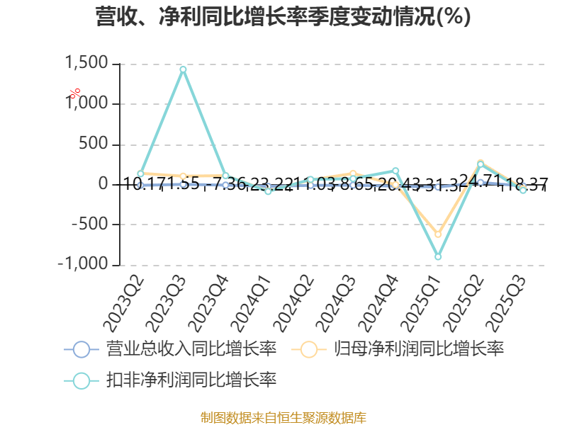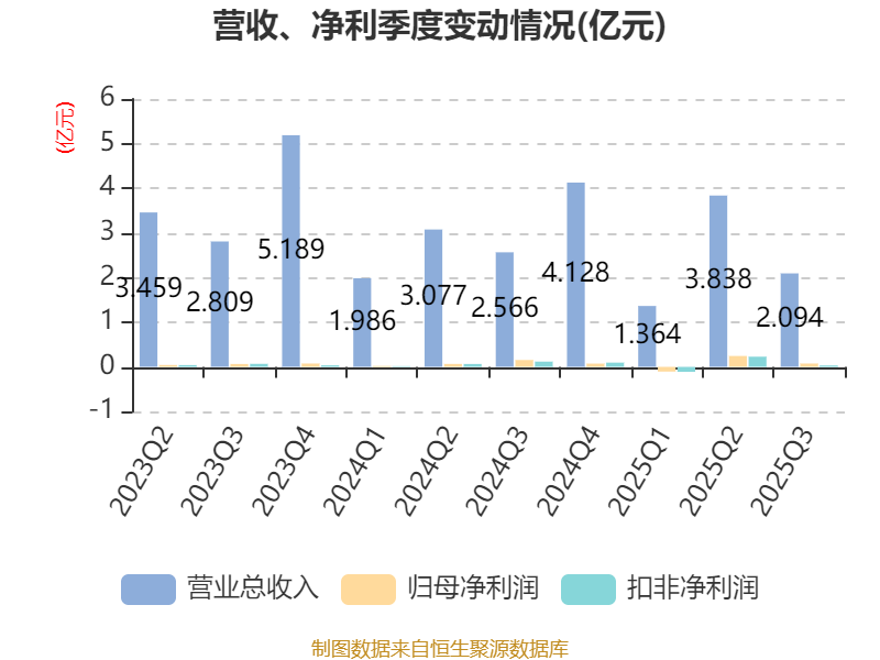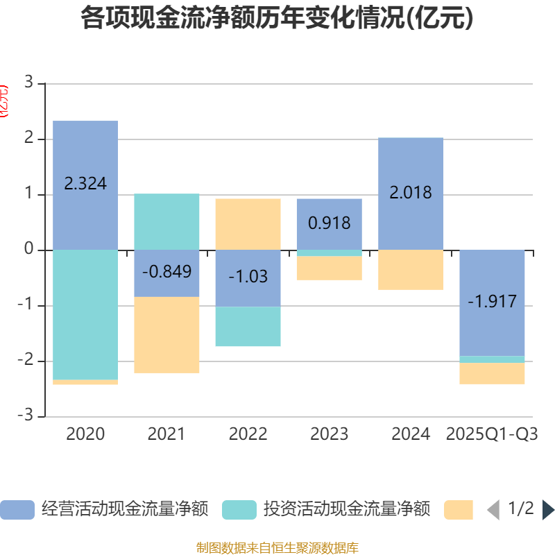 2025年前三季度,公司经营活动现金流净额为-1.92亿元,同比减少1.25亿元;筹资活动现金流净额-3826.47万元,同比增加1785.46万元;投资活动现金流净额-1234.3万元,上年同期为45.32万元。