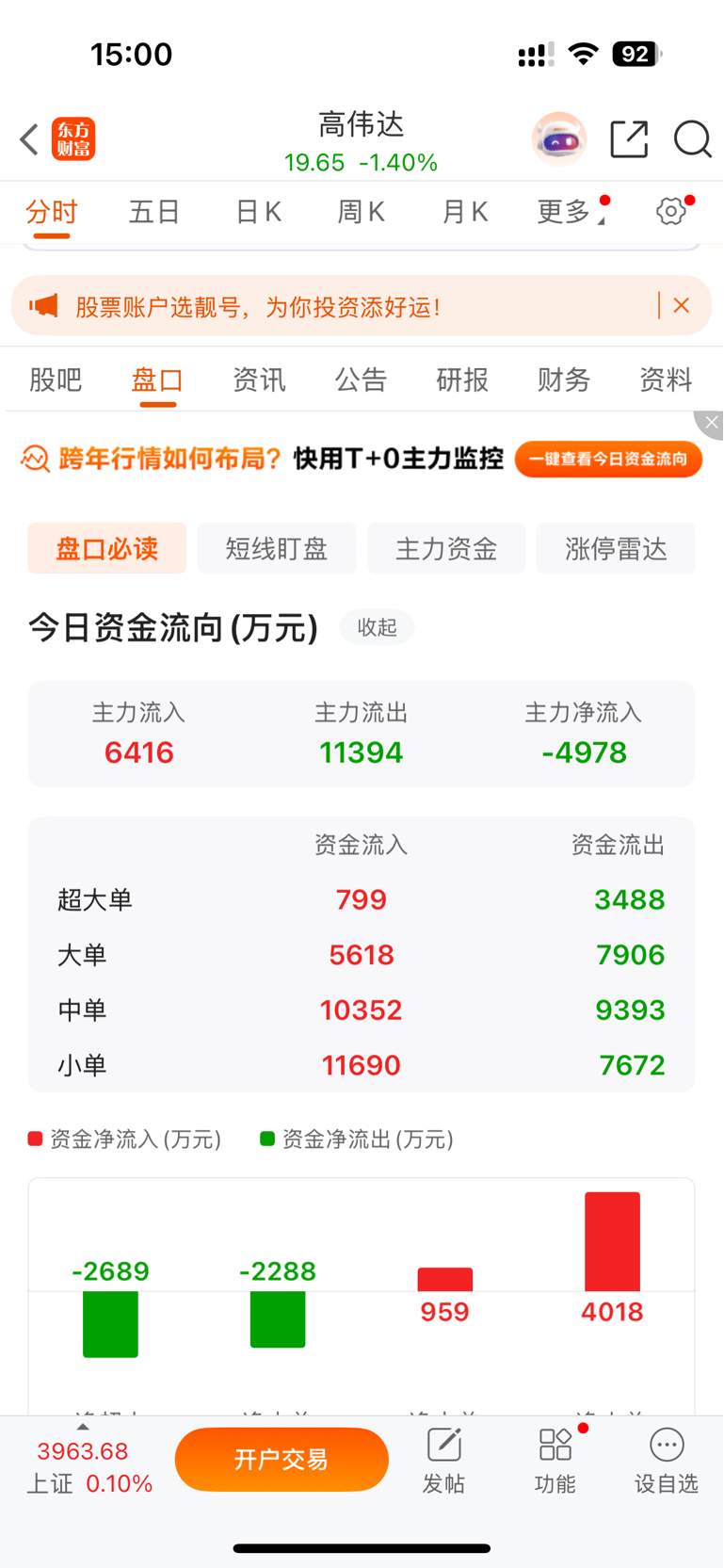 $高伟达(SZ300465)$ 备受煎熬的一周又结束了,今天主力净流出又是五千来万,看不到一点希望了,这货前半年连着跌过8周