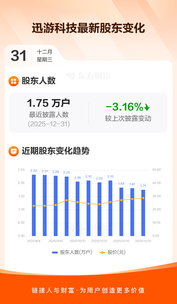迅游科技最新披露数据显示,截至12月31日公司股东户数为1.75万户,较上期(2025年12月19日)减少572户,降幅为3.16%。户均持有流通股数量由上期的9305股上升至9608股,户均持股金额由上期的26.00万元增加至27.58万元。