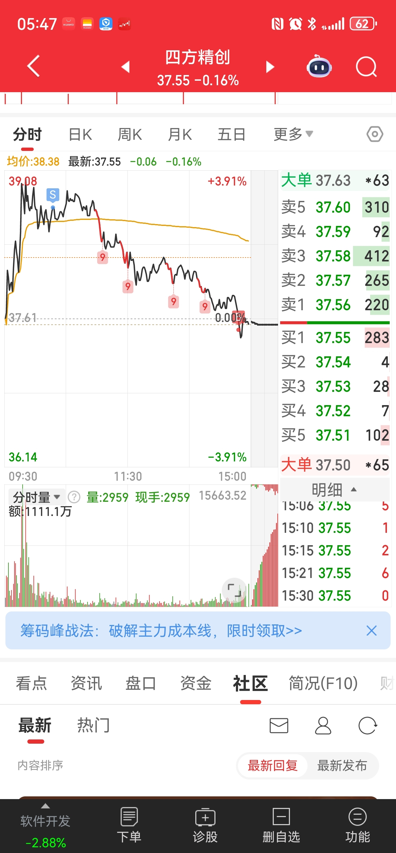 $四方精创(SZ300468)$ 今天这走势狗看了都摇头