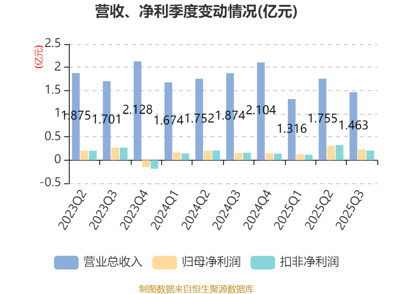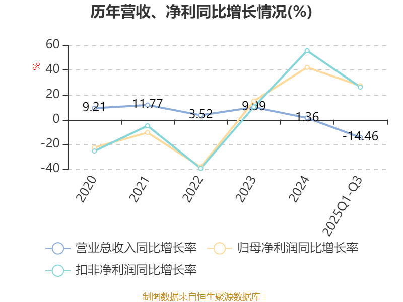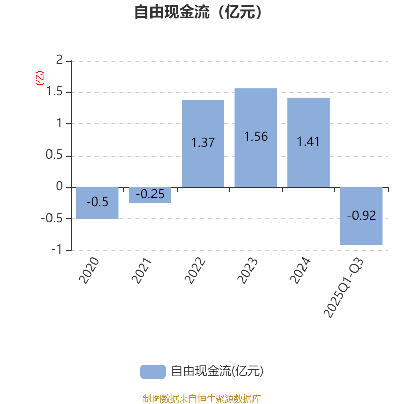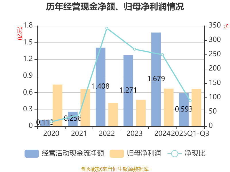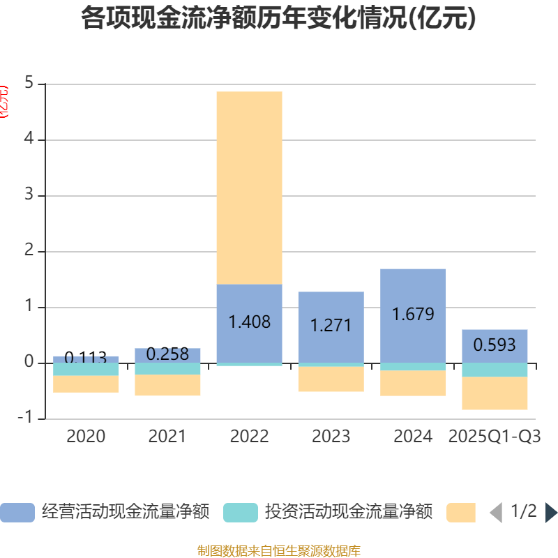 2025年前三季度,公司经营活动现金流净额为5934.86万元,同比增加1.1亿元;筹资活动现金流净额-5883.54万元,同比减少1619.76万元;投资活动现金流净额-2552.68万元,上年同期为-855.81万元。