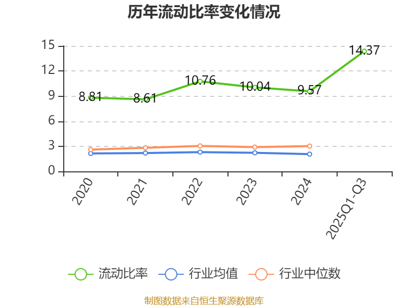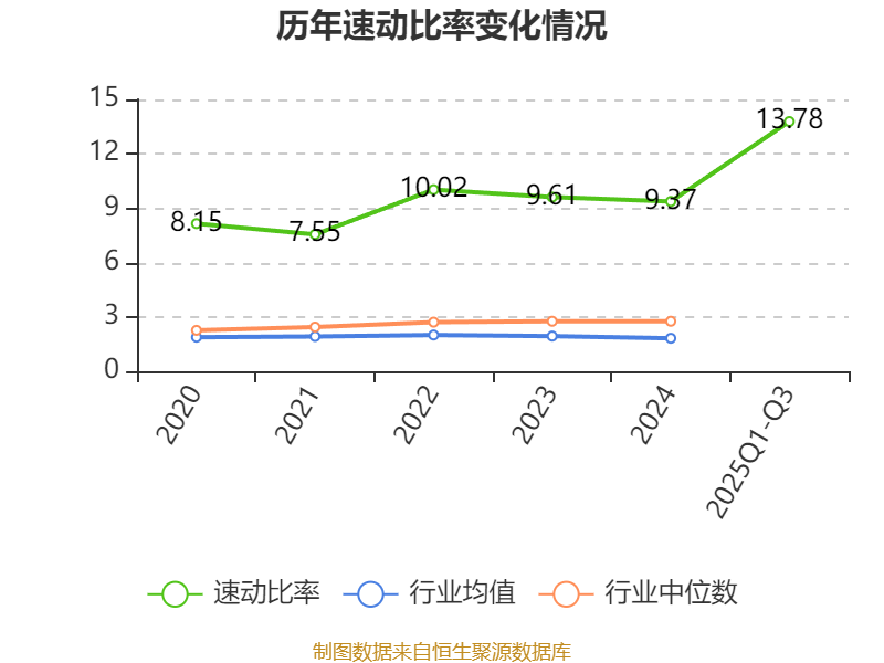 2025年前三季度,公司流动比率为14.37,速动比率为13.78。