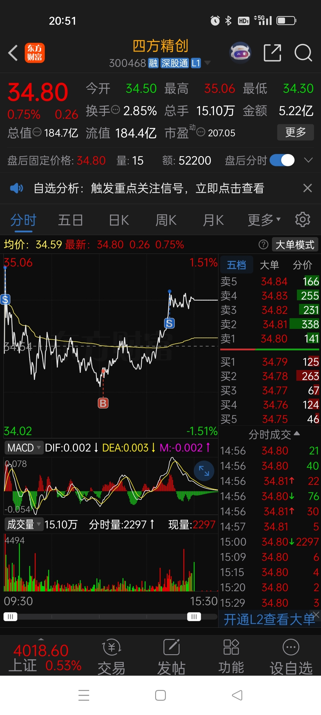 $四方精创(SZ300468)$ 这样做T会不会卖飞?