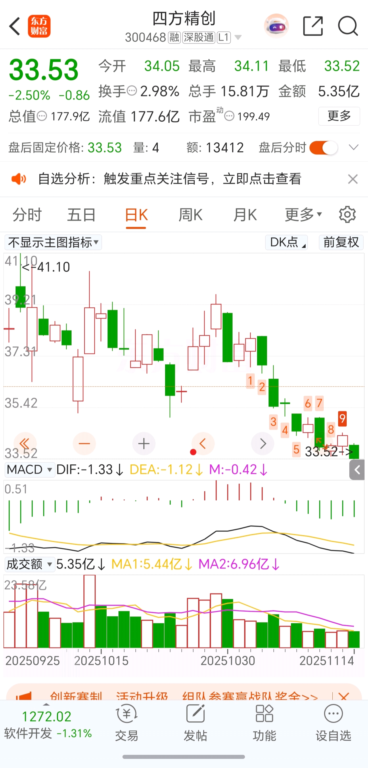 $四方精创(SZ300468)$ 跌的尽头就是希望。左侧可以建仓了,我的成本线就在K线里横着,不吹不捧,两周左右的时间耐心静待花开