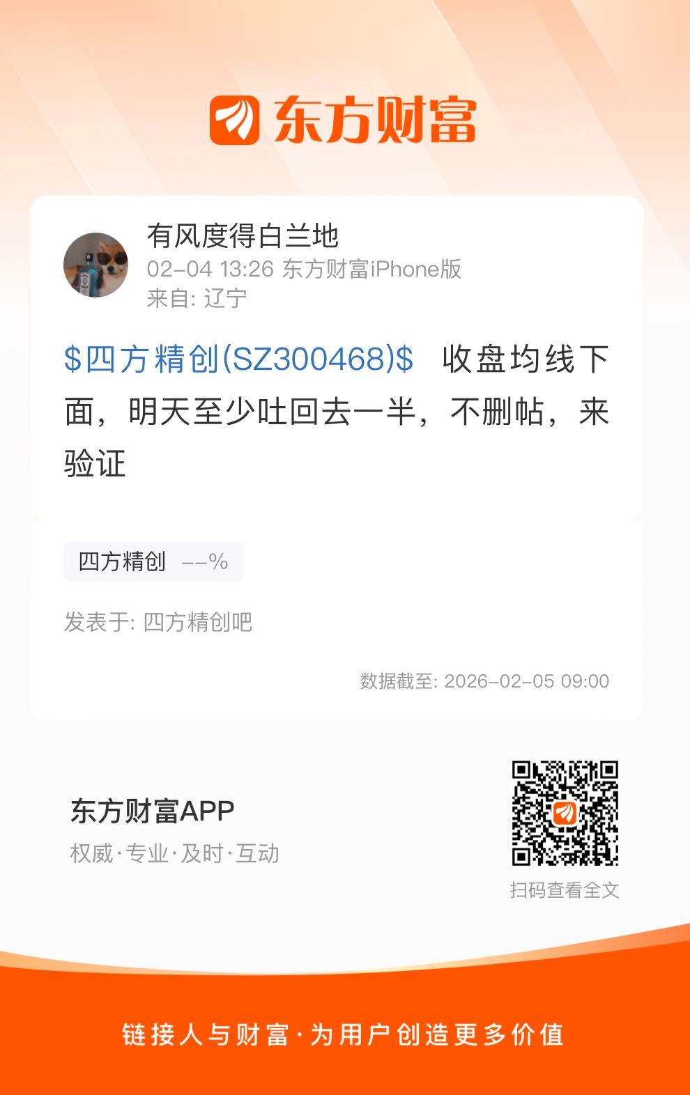 温馨提示: 1.根据《证券法》规定,禁止编造、传播虚假信息或者误导性信息,扰乱证券市场;2.用户在本社区发表的所有资料、言论等仅代表个人观点,与本网站立场无关,不对您构成任何投资建议。用户应基于自己的独立判断,自行决定证券投资并承担相应风险。《东方财富社区管理规定》
