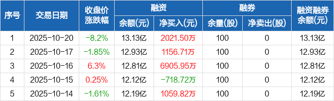 融资方面,当日融资买入1.27亿元,融资偿还1.06亿元,融资净买入2021.5万元,连续3日净买入累计1.01亿元。融券方面,融券卖出0股,融券偿还0股,融券余量100股,融券余额7267元。融资融券余额合计13.13亿元。