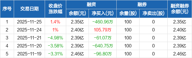 融资方面,当日融资买入1689.79万元,融资偿还2150.75万元,融资净偿还460.96万元。融券方面,融券卖出0股,融券偿还0股,融券余量100股,融券余额1232元。融资融券余额合计2.35亿元。
