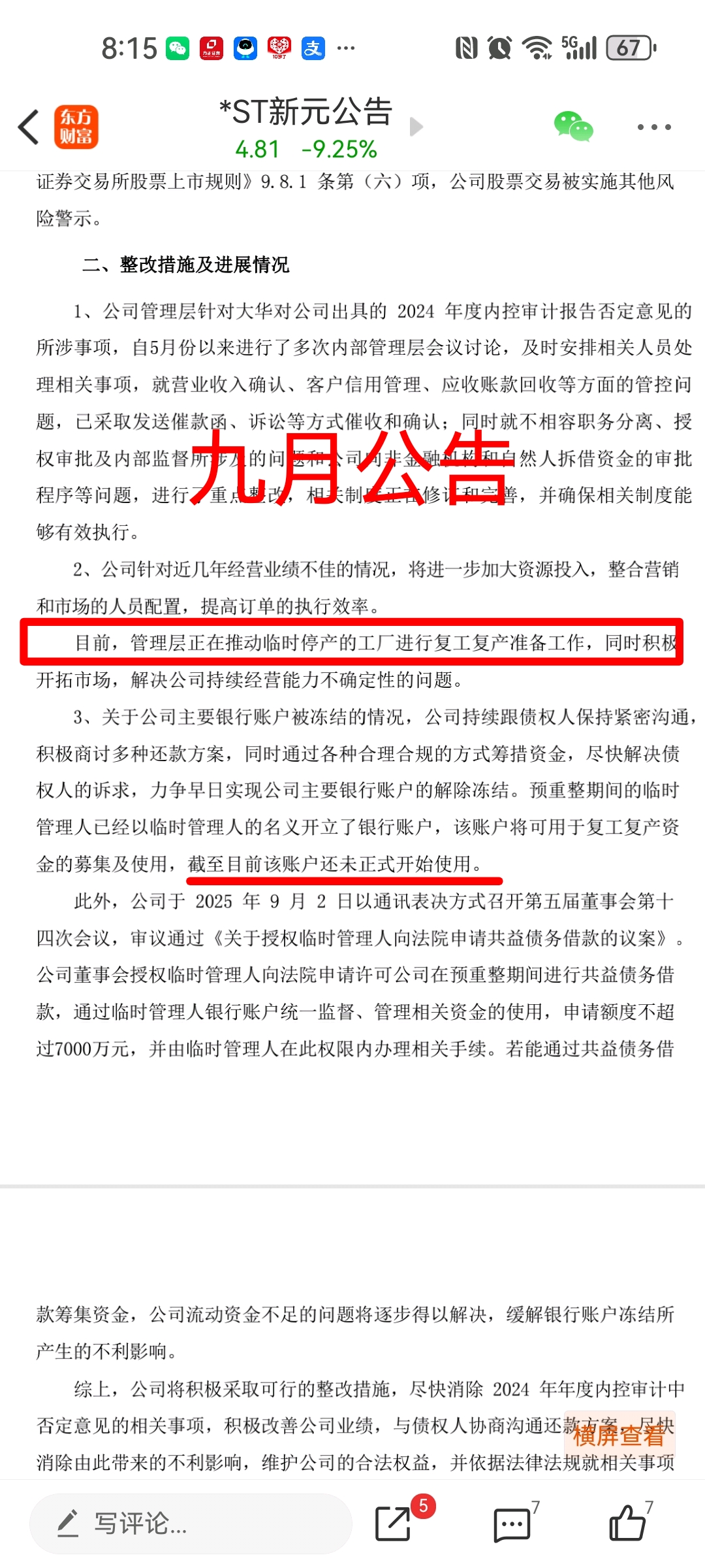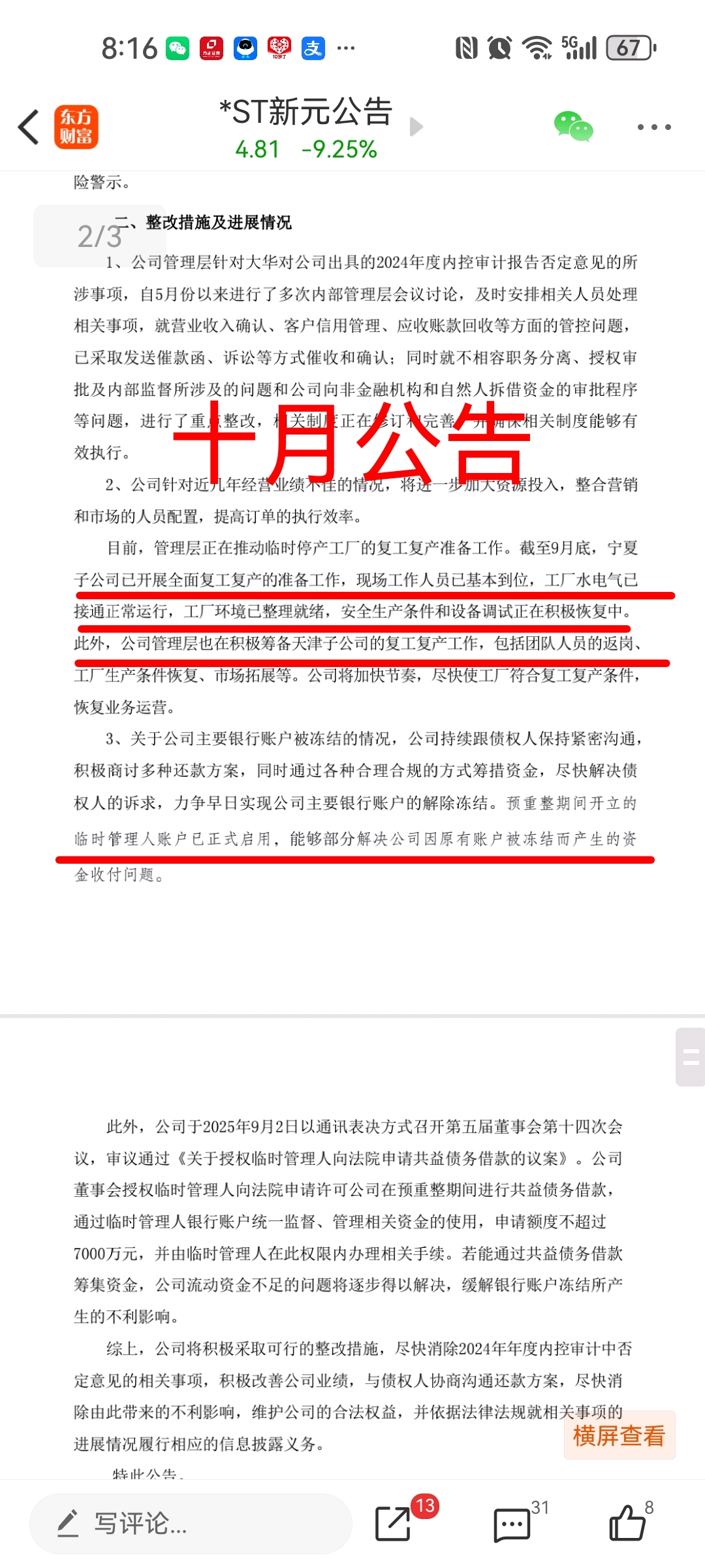 从十月份的进展公告上可以看出,预重整有条不紊地推进中!!管理人资金帐号已启用,复