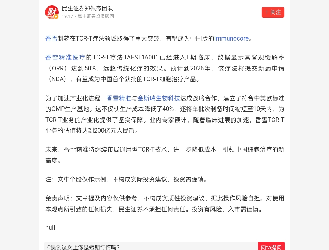 $北方长龙(SZ301357)$ $广生堂(SZ300436)$ $ST香雪(SZ300147)$ 香雪精准医疗的TCR-T疗法TAEST16001已经进入II期临床,数据显示其客观,香雪精准与金斯瑞生物科技达成战略合作,随着临床进展的加速,香雪TCR-T业务的估值将达到200亿元