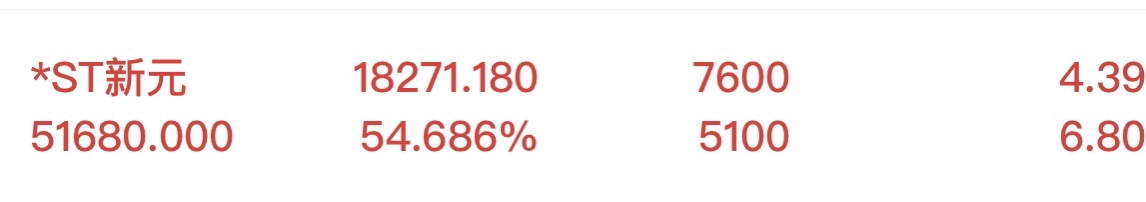 $*ST新元(SZ300472)$ 本来计划是足够比例降仓,微红卖出后看砸得那么狠,贪心做了个6毛钱的T,现在两个账户150多手等消息,成本降到4块5毛多了,最近1周怕卖飞,做T的手笔太小,否则指定能到3块5