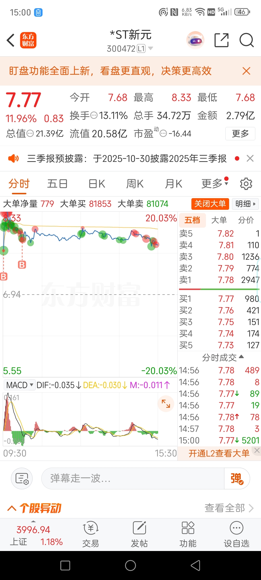 今天没卖,因为看了一下大单,本来想卖的,但是想着应该是有其他资金进来了。再格局一下吧,我相信老庄跑的差不多了。希望新进来的主力有格局!老庄的实力真的非常差,完全没格局那种。同时出两条利好消息。两个板都放定在那里的,竟然一个都没有