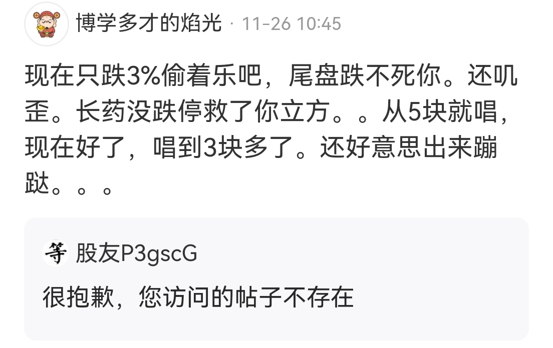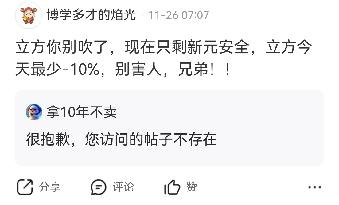 温馨提示: 1.根据《证券法》规定,禁止编造、传播虚假信息或者误导性信息,扰乱证券市场;2.用户在本社区发表的所有资料、言论等仅代表个人观点,与本网站立场无关,不对您构成任何投资建议。用户应基于自己的独立判断,自行决定证券投资并承担相应风险。《东方财富社区管理规定》