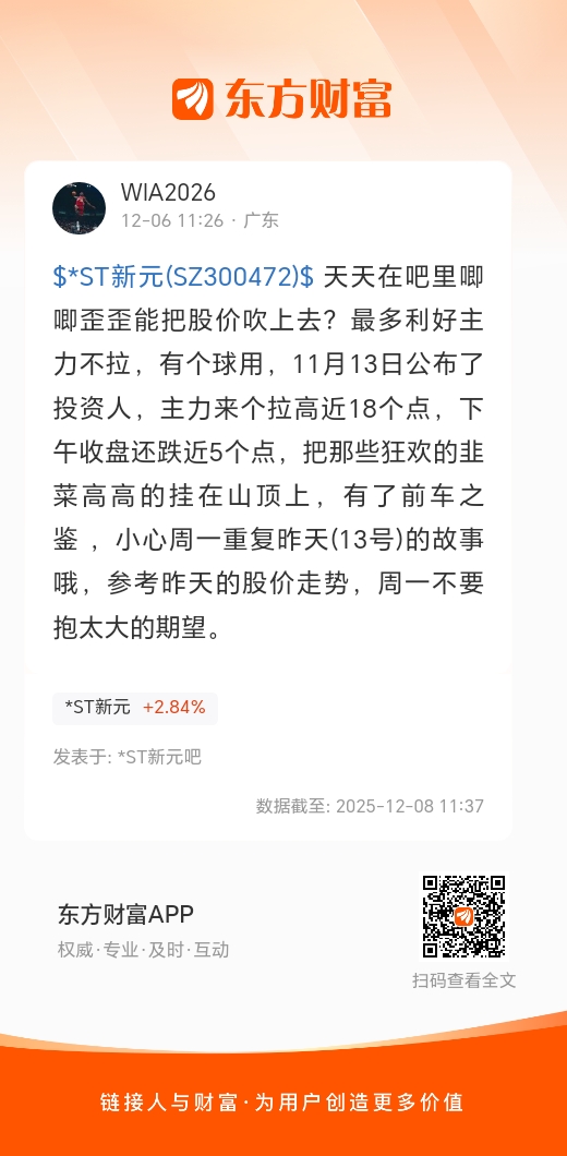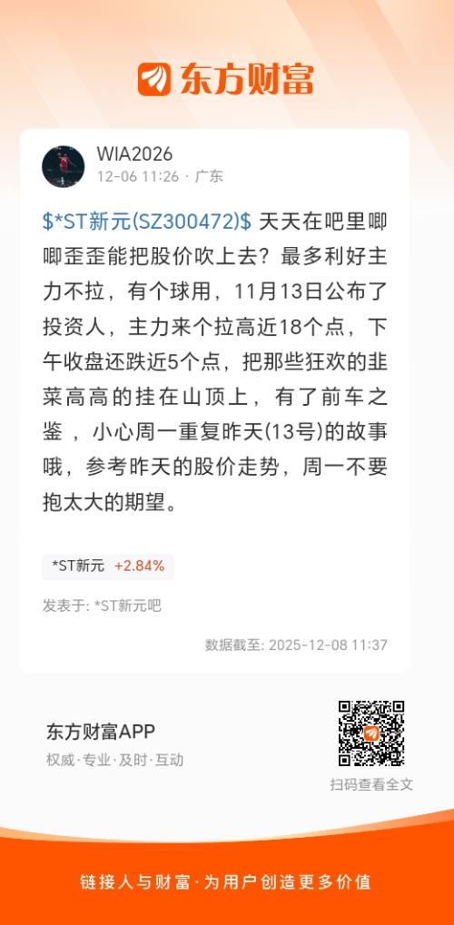 $*ST新元(SZ300472)$ 天天在吧里唧唧歪歪能把股价吹上去?最多利好主力不拉,有个球用,11月13日公布了投资人,主力来个拉高近18个点,下午收盘还跌近5个点,把那些狂欢的韭菜高高的挂在山顶上,有了前车之鉴 ,小心周一重复昨天(13号)的故事哦,参考昨天的股价走势,周一不要抱太大的期望。