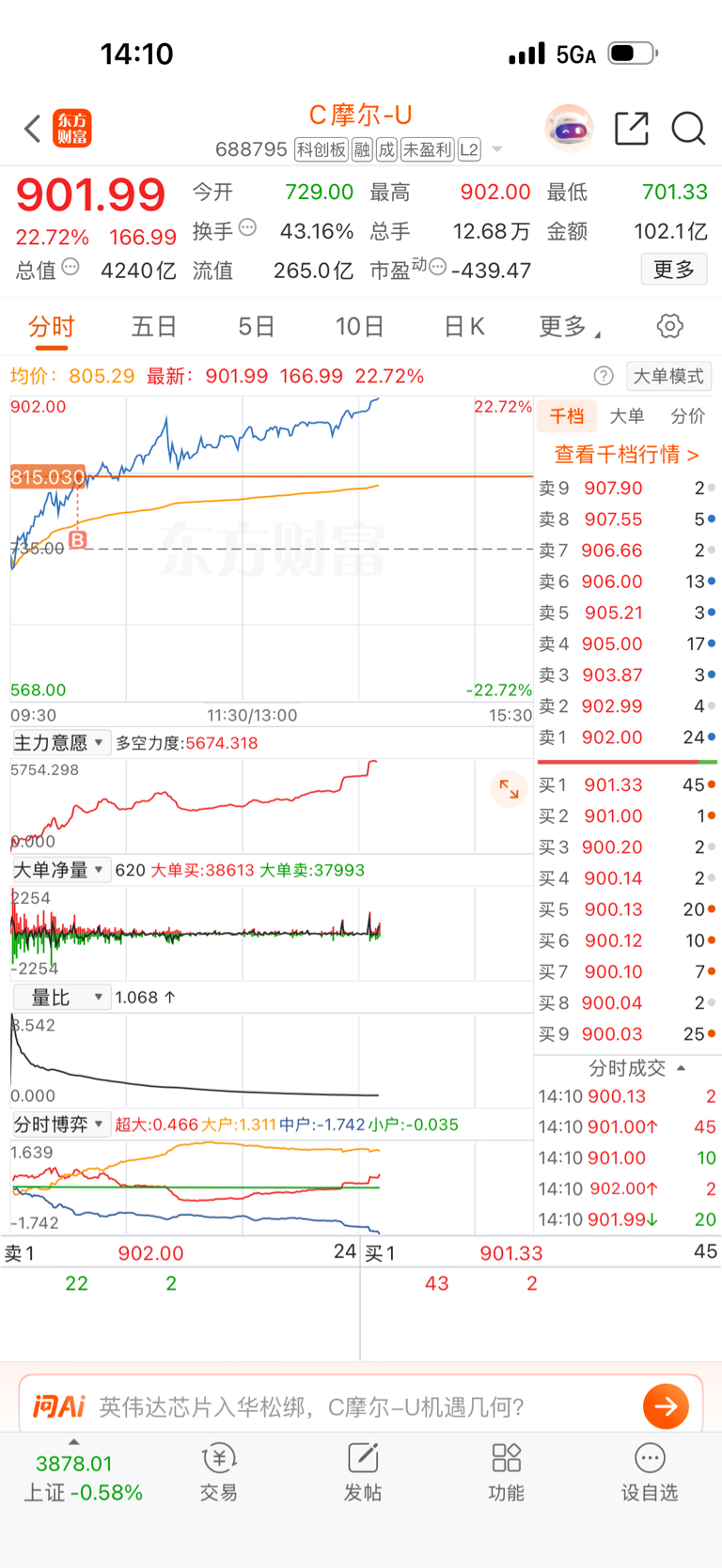 下午摩尔继续暴涨早上出了致尚科技在摩尔补了亏损..看样子上1000就这几天的事.