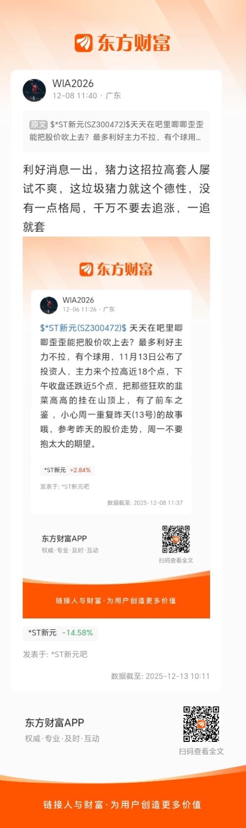 $*ST新元(SZ300472)$ 天天在吧里唧唧歪歪能把股价吹上去?最多利好主力不拉,有个球用,11月13日公布了投资人,主力来个拉高近18个点,下午收盘还跌近5个点,把那些狂欢的韭菜高高的挂在山顶上,有了前车之鉴 ,小心周一重复昨天(13号)的故事哦,参考昨天的股价走势,周一不要抱太大的期望。