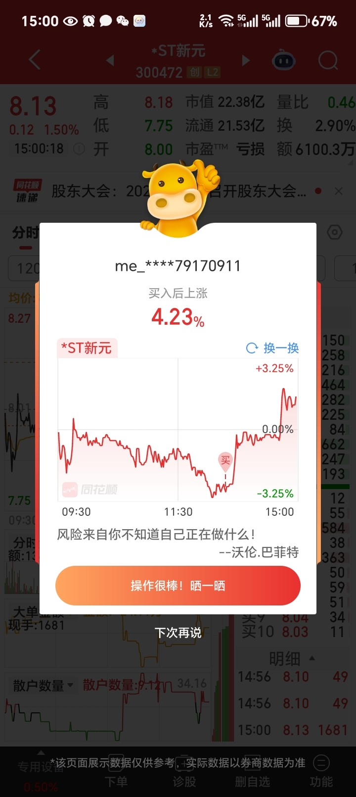 $*ST新元(SZ300472)$ 与新元一起成长, 我又回来了,明天吃大肉肉
