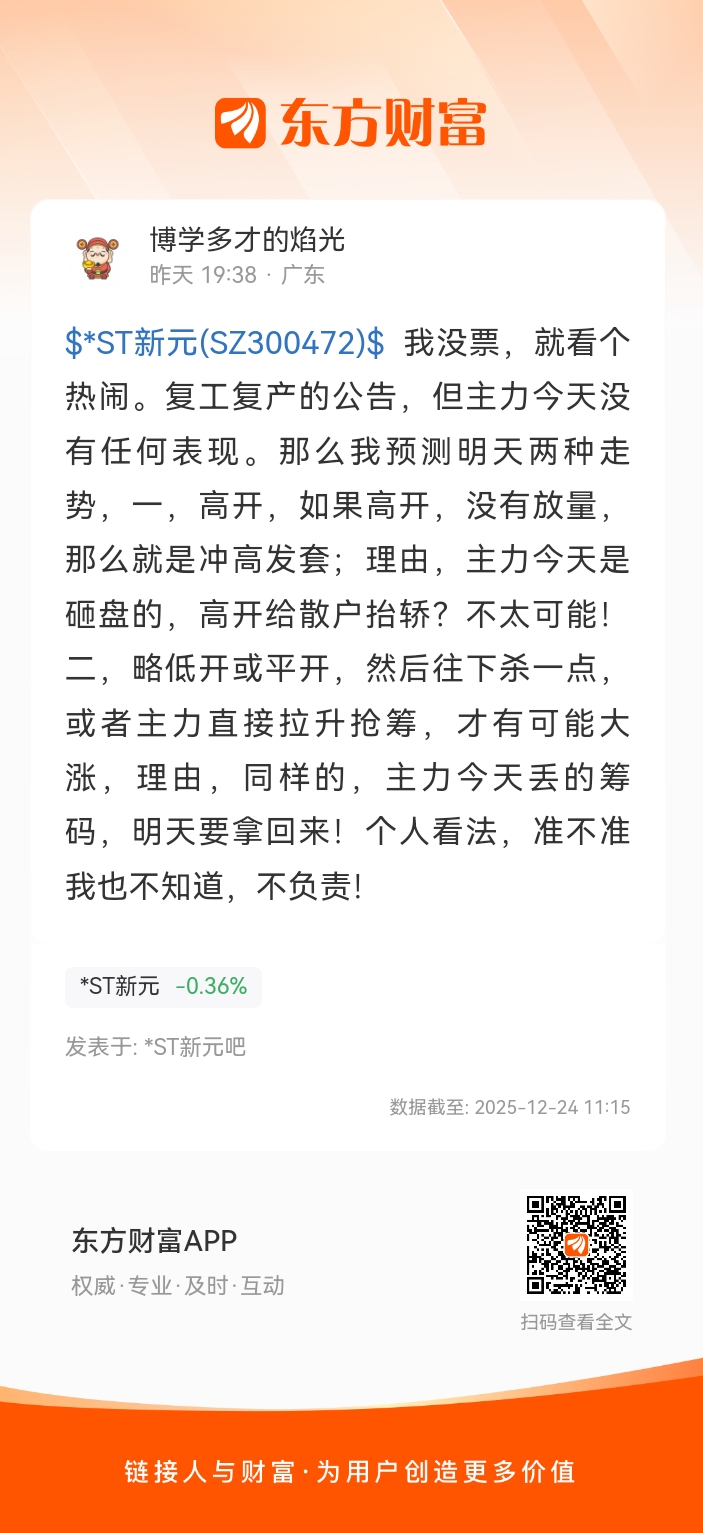$*ST新元(SZ300472)$ 我没票,就看个热闹。复工复产的公告,但主力今天没有任何表现。那么我预测明天两种走势,一,高开,如果高开,没有放量,那么就是冲高发套;理由,主力今天是砸盘的,高开给散户抬轿?不太可能!二,略低开或平开,然后往下杀一点,或者主力直接拉升抢筹,才有可能大涨,理由,同样的,主力今天丢的筹码,明天要拿回来!个人看法,准不准我也不知道,不负责!