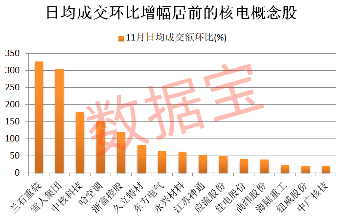 从成交情况来看,部分概念股近期成交活跃度大幅提升。据数据宝统计,截至11月7日收盘,11月以来日均成交额较上个月增长的有19只,其中9股环比增幅达50%以上。兰石重装、雪人集团、中核科技、哈空调、浙富控股日均成交额环比增幅排在前五位。