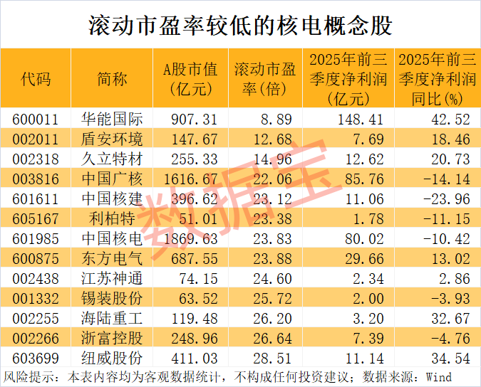 上述这13只低市盈率的核电概念股中,截至11月7日收盘,市净率低于2倍的有5只,分别为中国核电、中国广核、东方电气、中国核建、华能国际。
