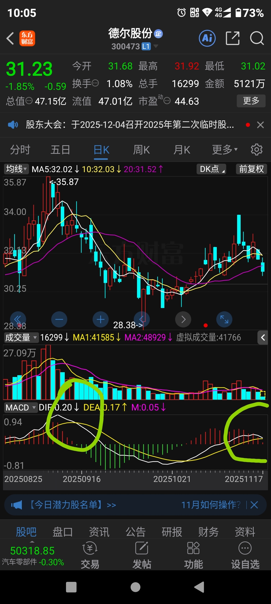 $德尔股份(SZ300473)$ MACD指标~正在交叉向下