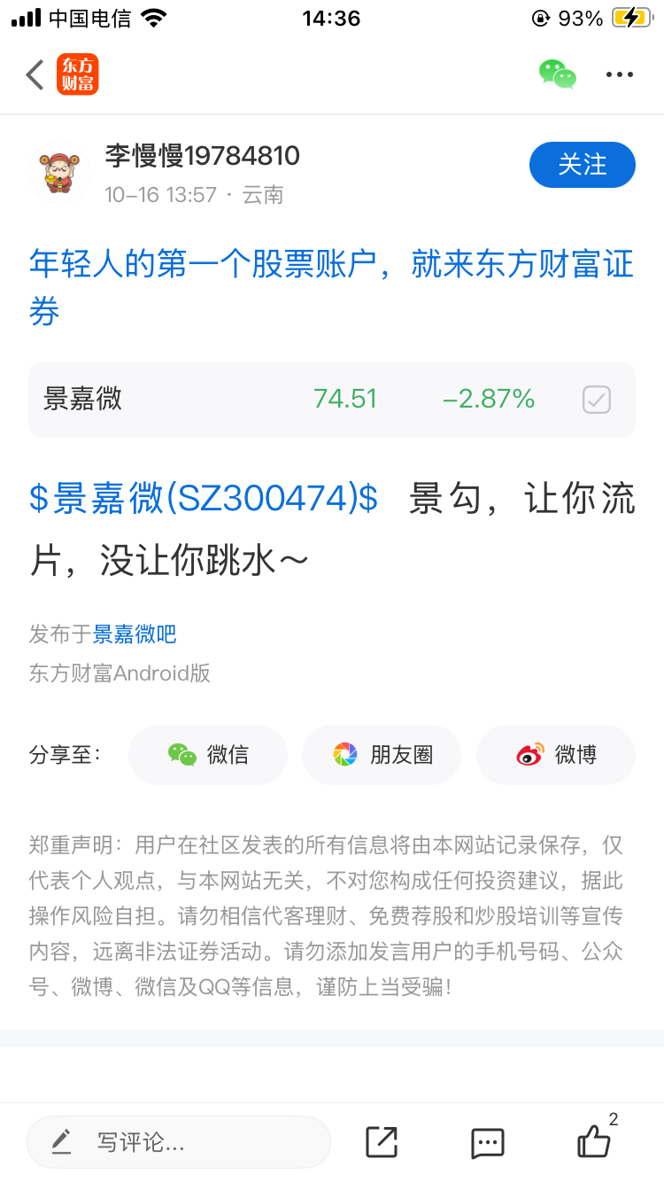 温馨提示: 1.根据《证券法》规定,禁止编造、传播虚假信息或者误导性信息,扰乱证券市场;2.用户在本社区发表的所有资料、言论等仅代表个人观点,与本网站立场无关,不对您构成任何投资建议。用户应基于自己的独立判断,自行决定证券投资并承担相应风险。《东方财富社区管理规定》