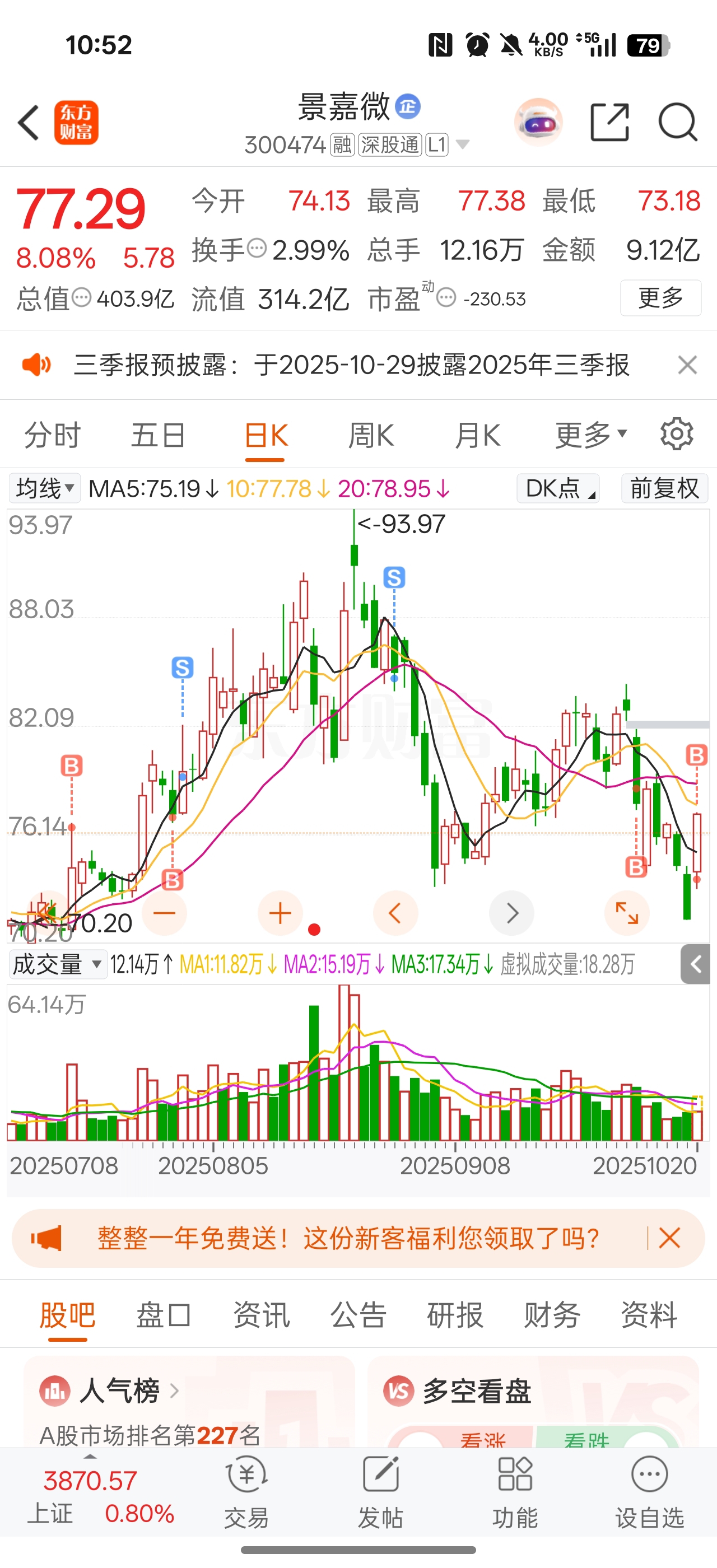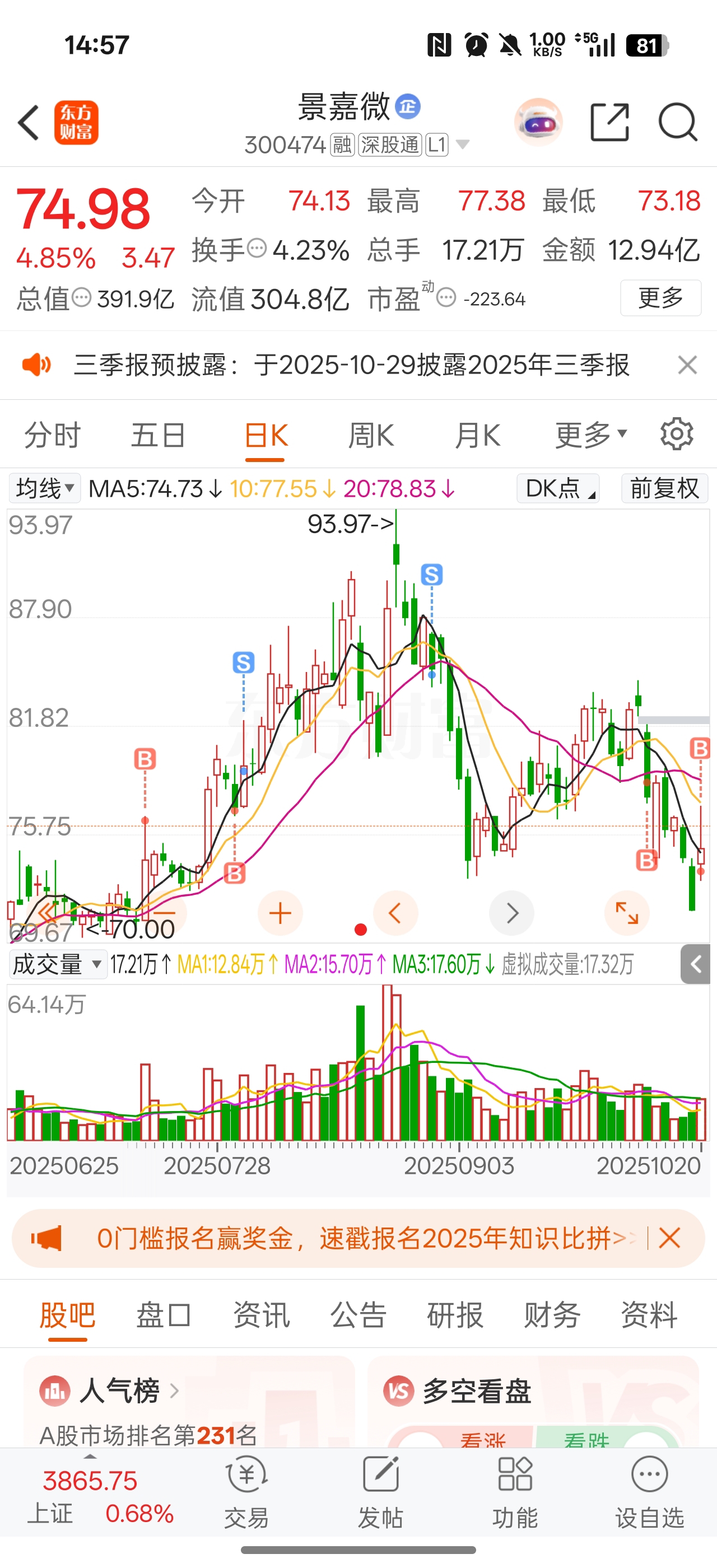 $景嘉微(SZ300474)$ 说实在的,我今天盯着一天盘了。跳水的时候我是想t的,但是想想今天为什么要买入,于是还是忍着了,我不知道这是否正确,但如果不看好,为什么要买呢。如果还能向上那做t又显得没必要。