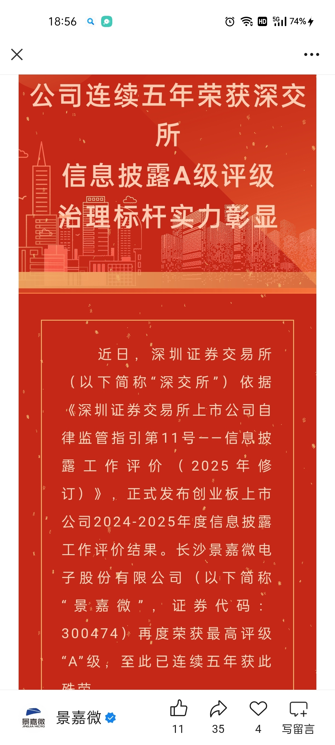 $景嘉微(SZ300474)$ 景嘉微连续五年获深交所信披A级评级