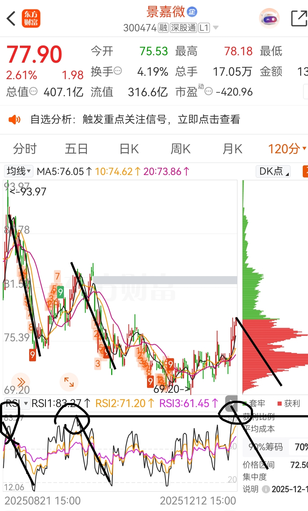 $景嘉微(SZ300474)$ 干货来袭,我来带大家逃顶来啦。。好好看看。。。。顶背离。。。rsi也到顶了。。。。要下来了。。。要遵守游戏规则。