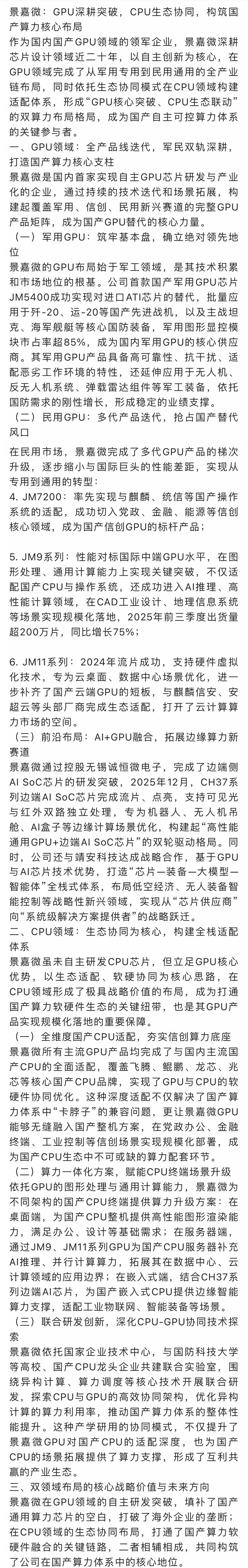$景嘉微(SZ300474)$ 未来,景嘉微将持续加大GPU研发投入,推进JM10系列等下一代高性能GPU的量产,进一步对标国际高端产品;同时深化与国产CPU企业的合作,持续优化算力协同方案,拓展AI算力、低空经济、数字孪生等新兴场景的应用。依托“GPU核心突破+CPU生态联动”的布局,景嘉微将持续推动国产算力体系的自主可控进程,成为全球算力芯片领域的重要国产力量。